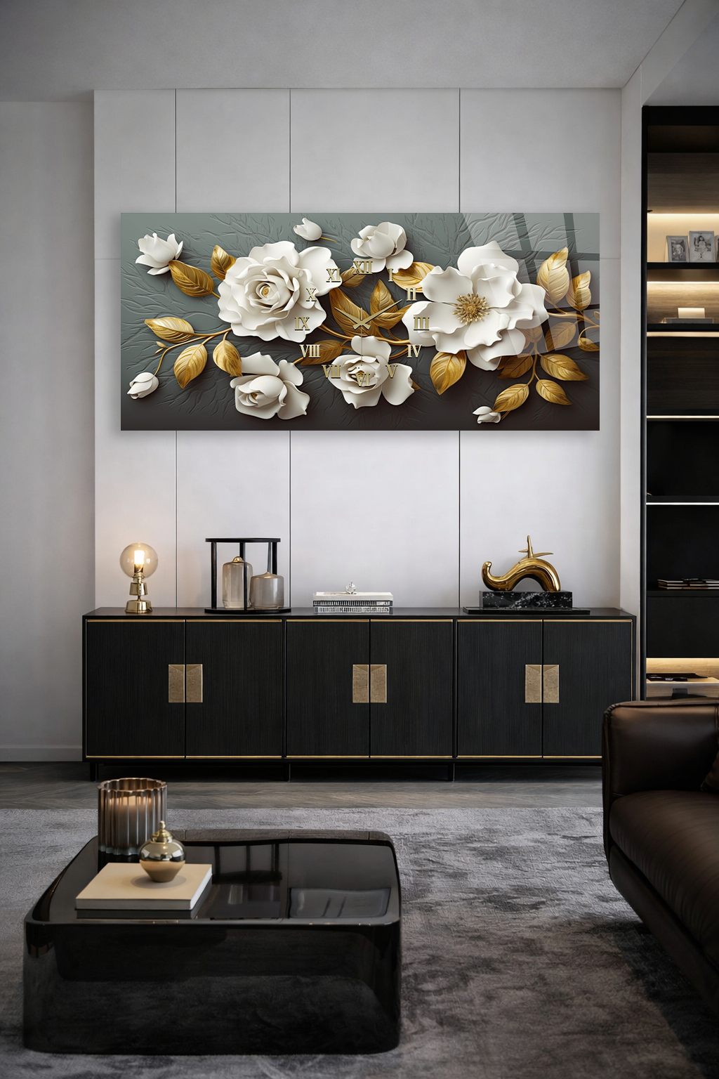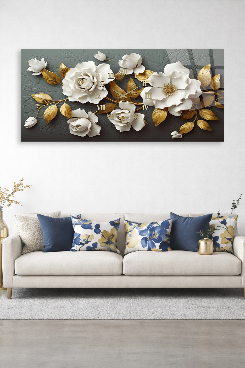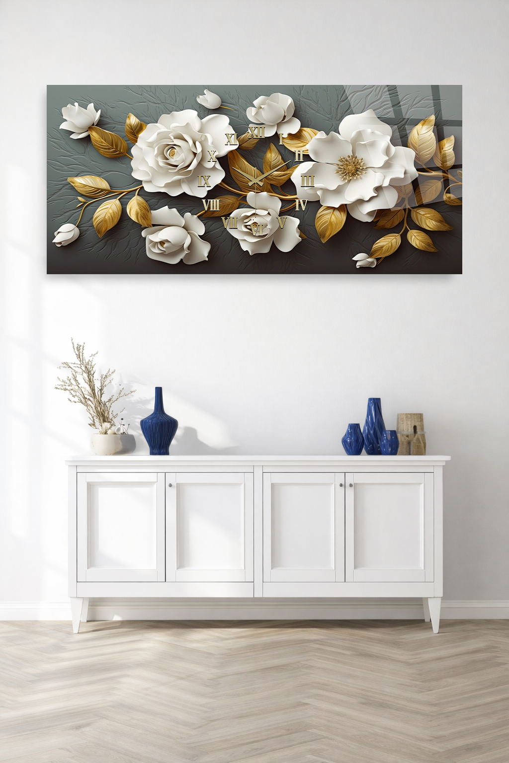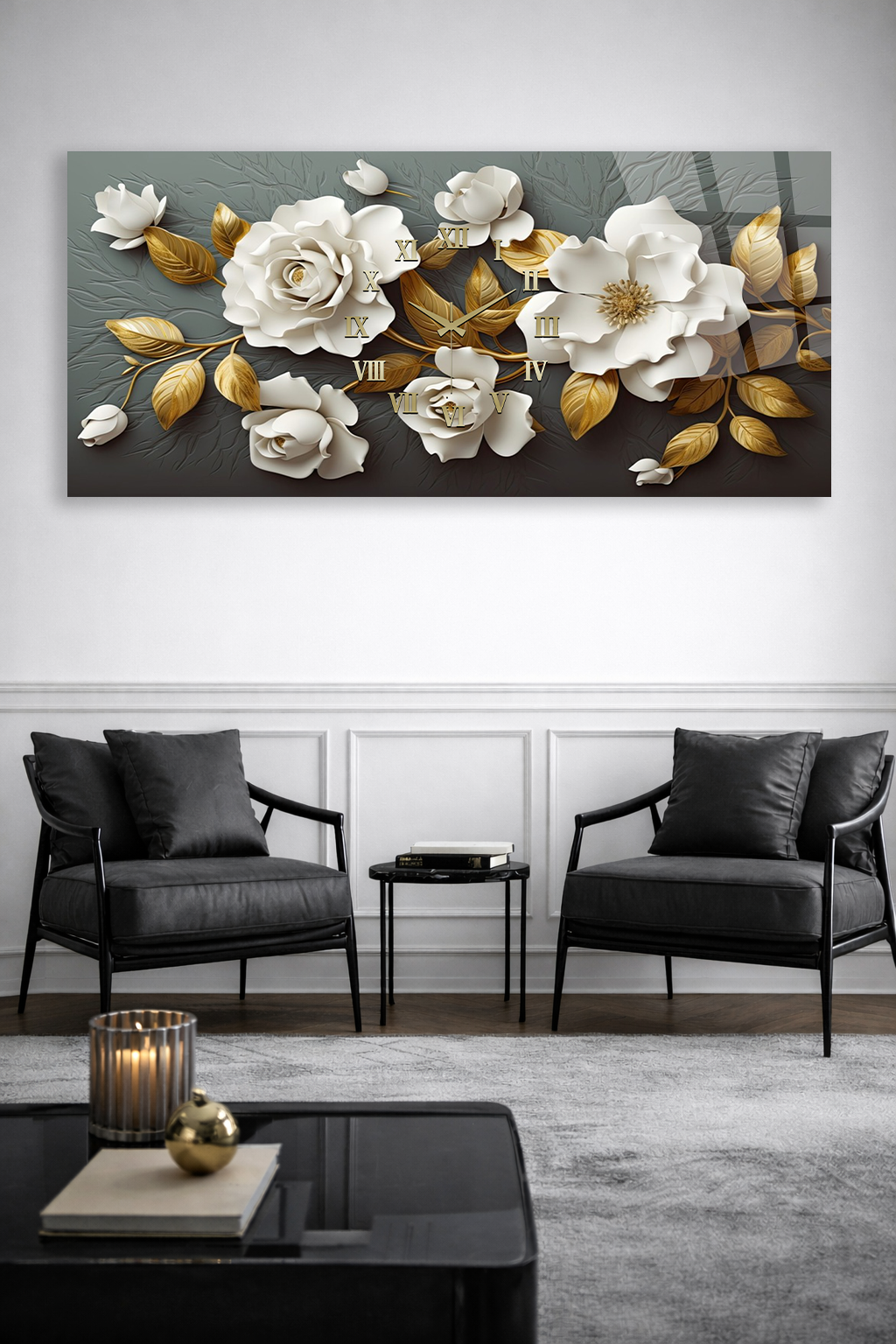 KIRILMAZ CAM DUVAR SAATİ , HEM TABLO HEM SAAT BEYAZ GÜL ALTIN YAPRAK LÜKS TASARIM EV OFİS HEDİYESİ