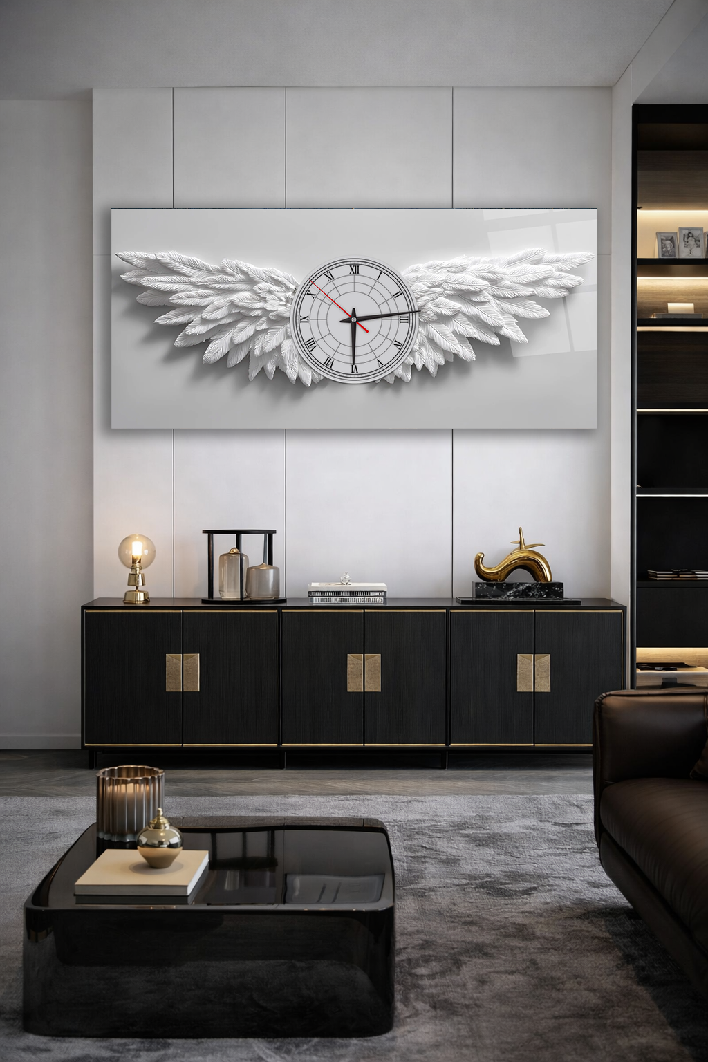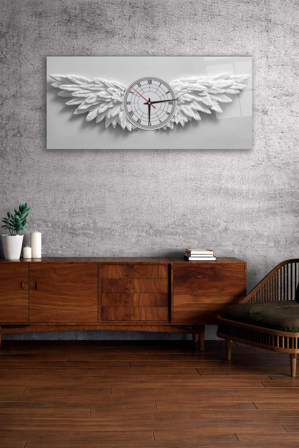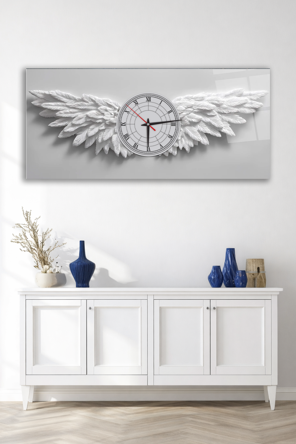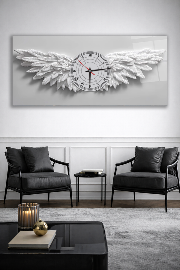 KIRILMAZ CAM DUVAR SAATİ , HEM TABLO HEM SAAT BEYAZ MELEK KANATLI SAAT MINIMAL ŞIK EV OFİS HEDİYESİ