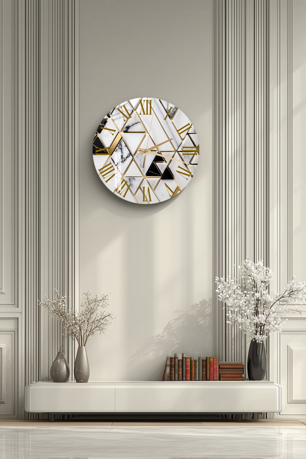 KIRILMAZ CAM DUVAR SAATİ, HEM TABLO HEM SAAT BEYAZ MERMER ALTIN GEOMETRİK LÜKS EV OFİS HEDİYESİ