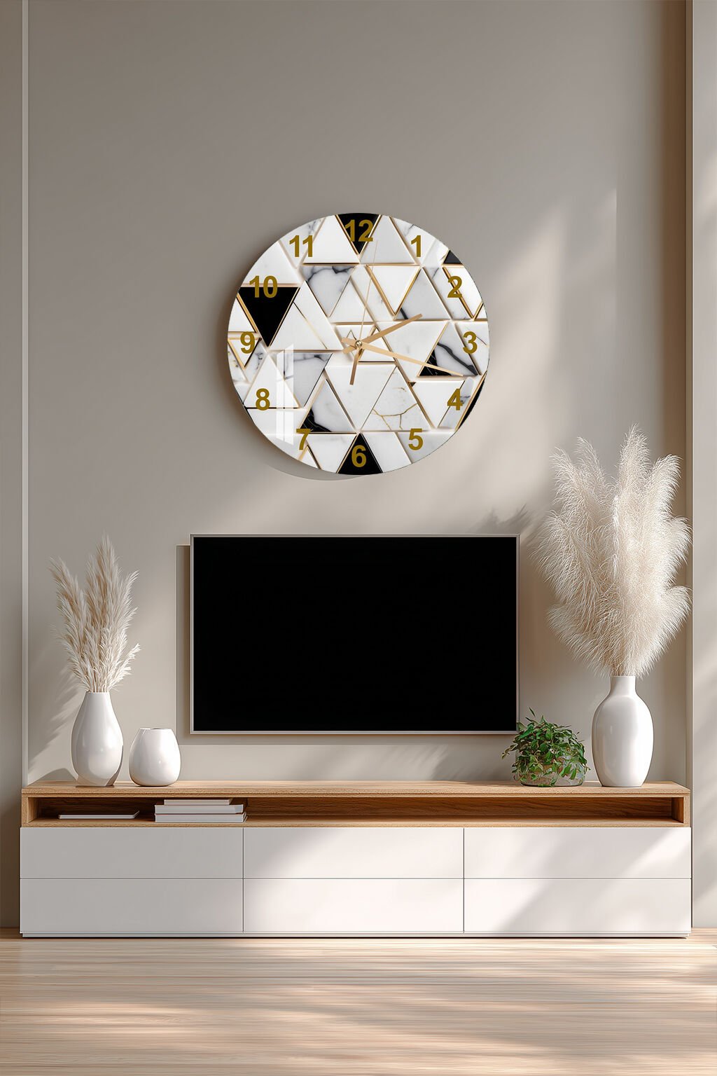 KIRILMAZ CAM DUVAR SAATİ, HEM TABLO HEM SAAT BEYAZ MERMER ALTIN GEOMETRİK LÜKS TASARIM EV OFİS HEDİYESİ