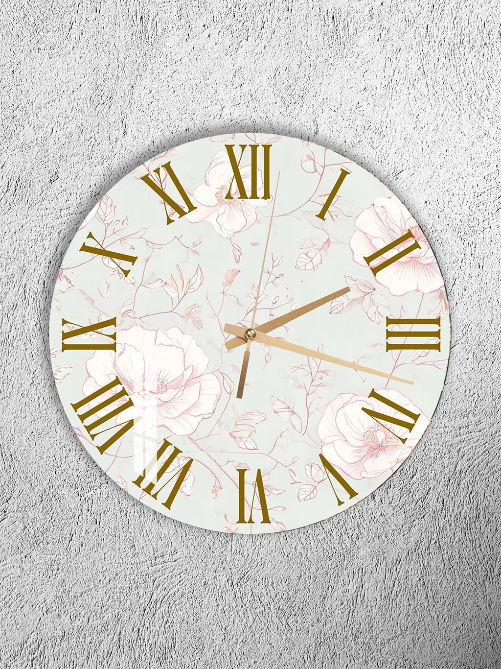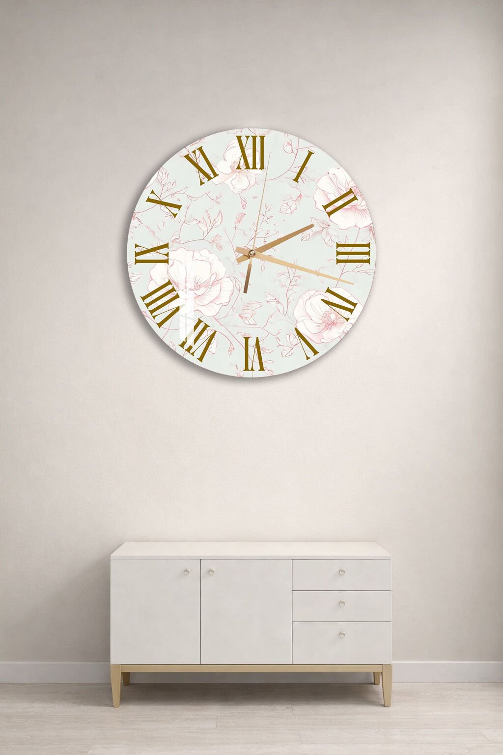 KIRILMAZ CAM DUVAR SAATİ, HEM TABLO HEM SAAT BEYAZ ZEMİN ALTIN ÇİÇEK DESEN ZARİF TASARIM EV OFİS HEDİYESİ