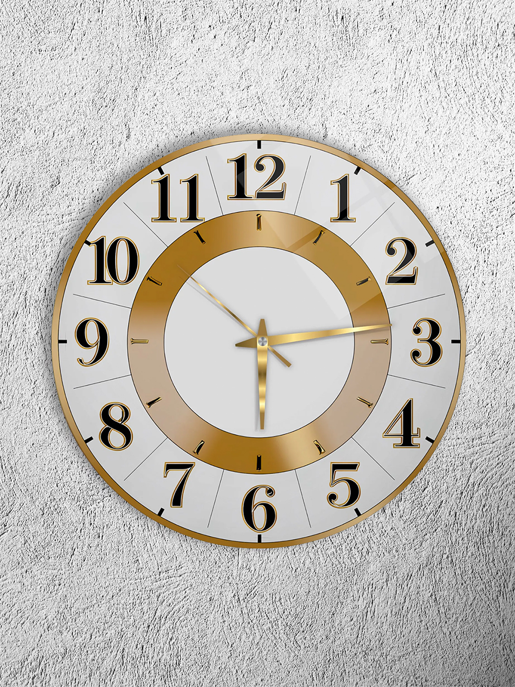 KIRILMAZ CAM DUVAR SAATİ, HEM TABLO HEM SAAT BEYAZ ZEMİN GOLD HALKALI MODERN MİNİMAL TASARIM EV OFİS HEDİYESİ