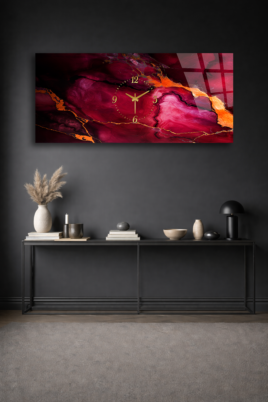KIRILMAZ CAM DUVAR SAATİ , HEM TABLO HEM SAAT BORDO MERMER ALTIN DAMAR TASARIM EV OFİS HEDİYESİ