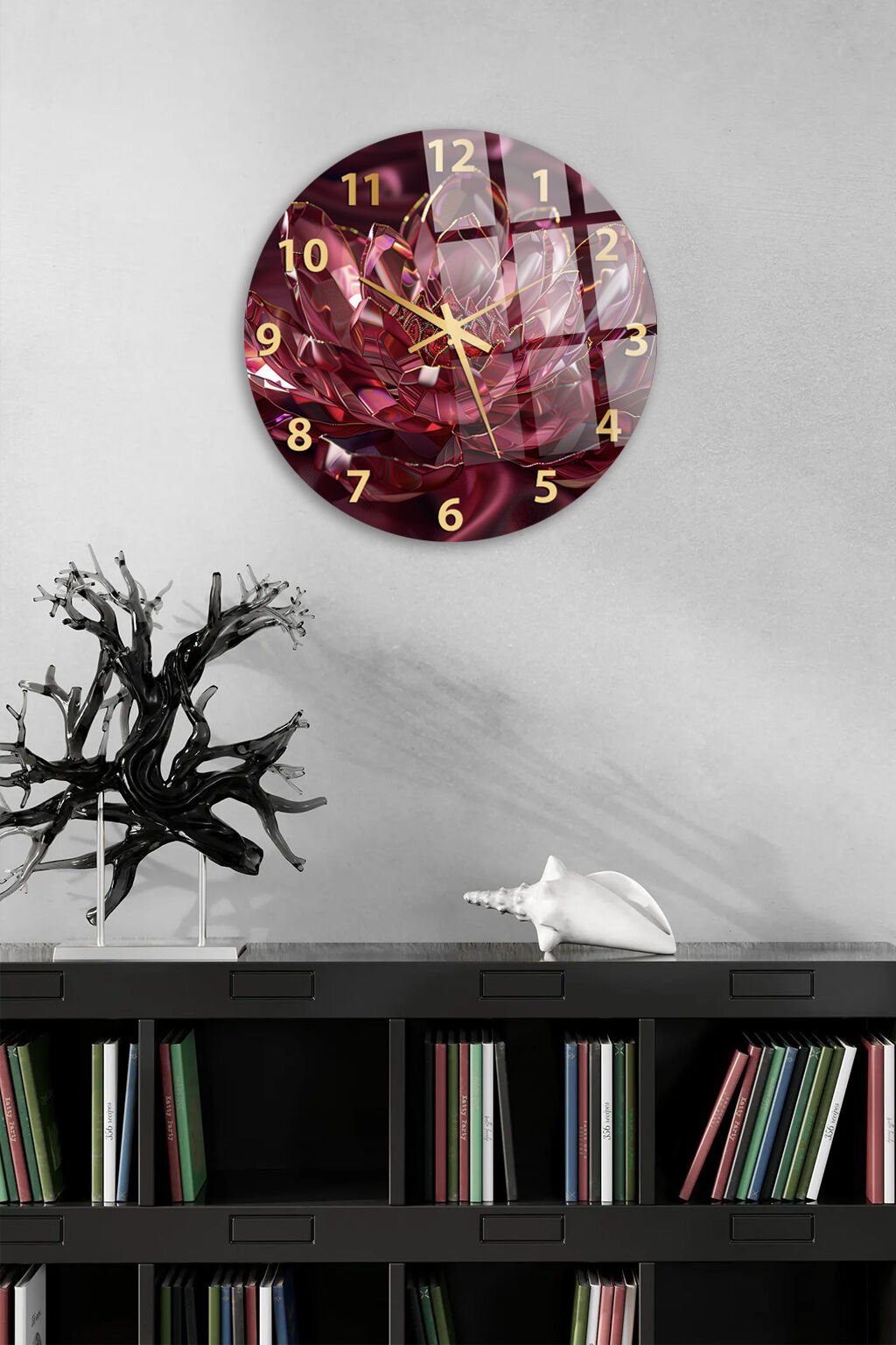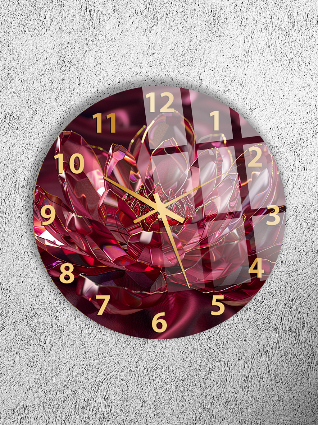 KIRILMAZ CAM DUVAR SAATİ, HEM TABLO HEM SAAT BORDO TON SOYUT ÇİÇEK DESENLİ EV OFİS HEDİYESİ
