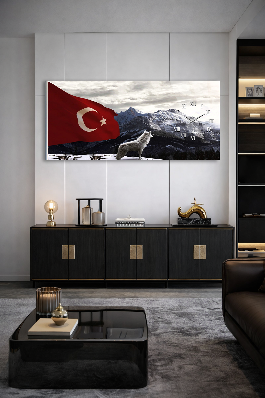 KIRILMAZ CAM DUVAR SAATİ , HEM TABLO HEM SAAT BOZKURT VE TÜRK BAYRAĞI EV OFİS HEDİYESİ