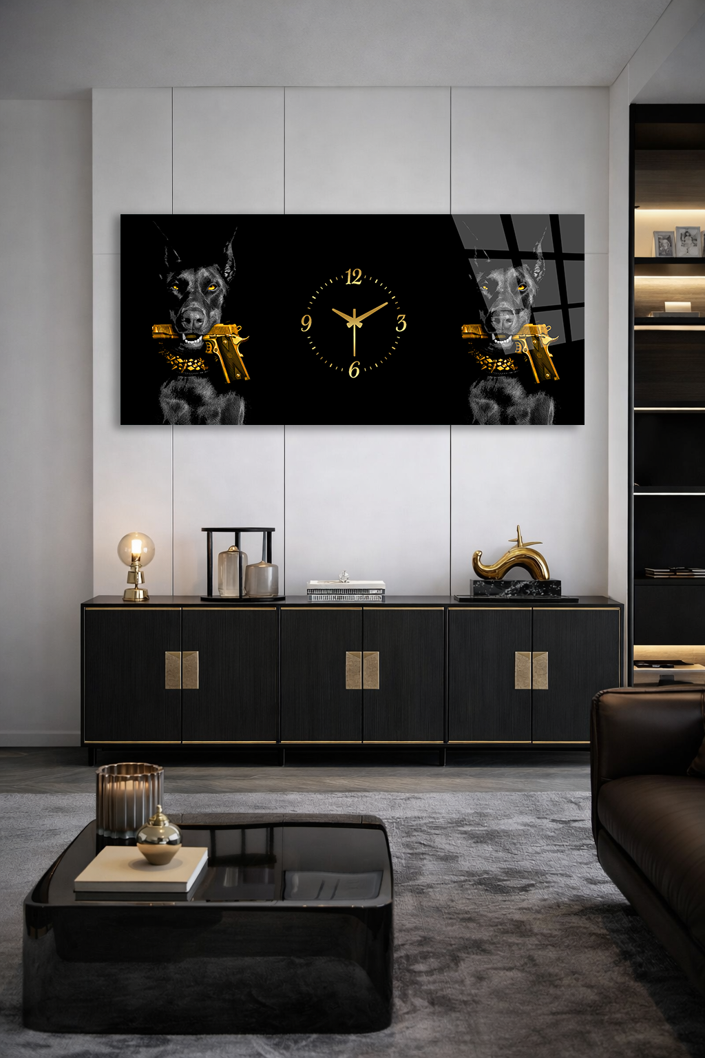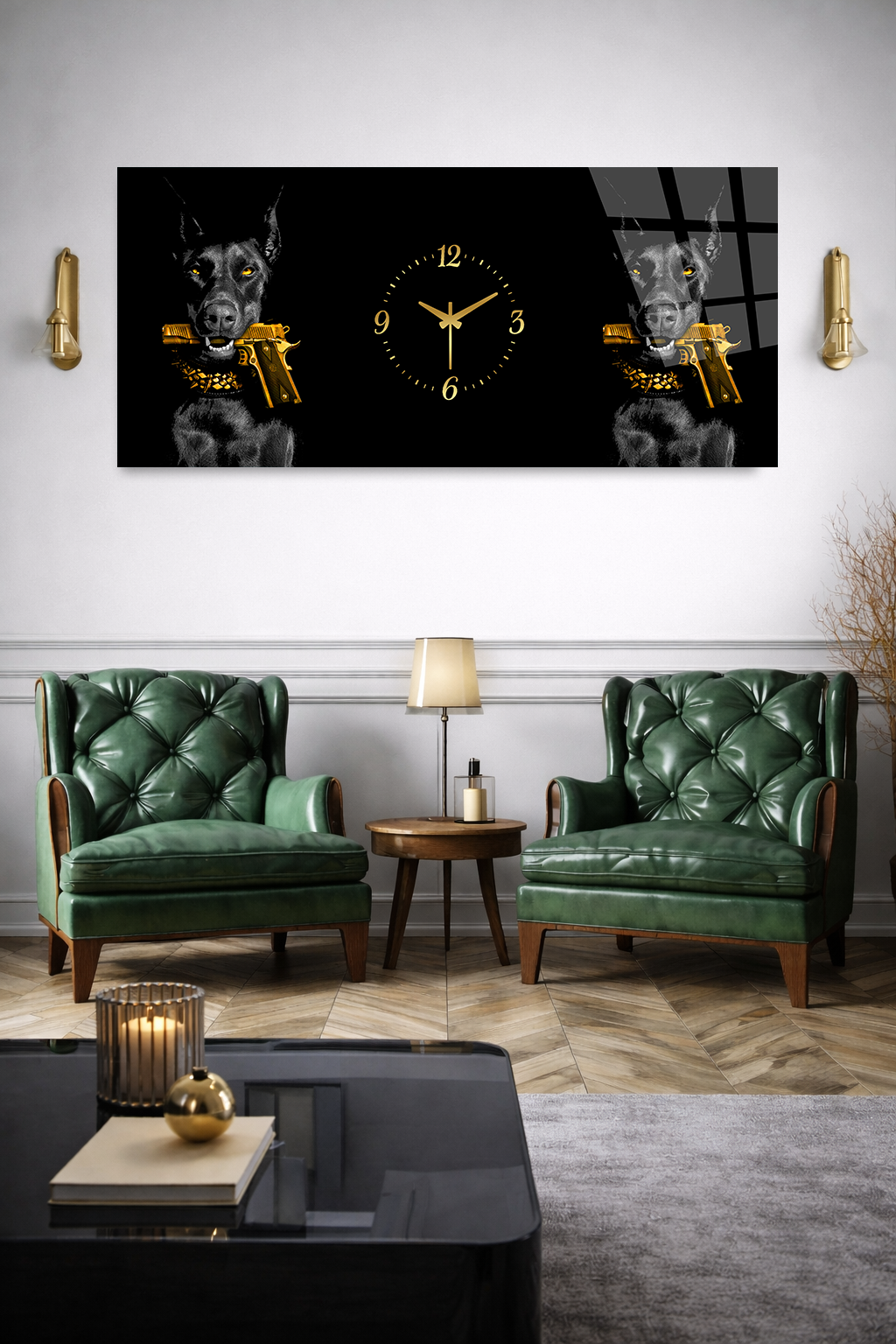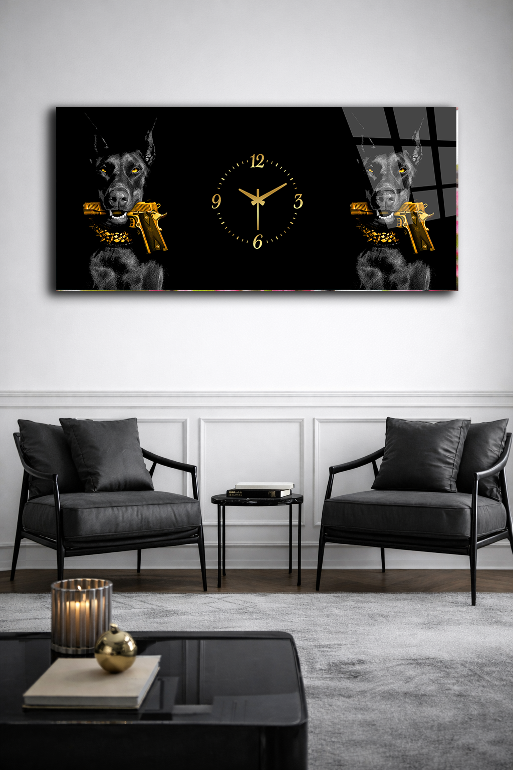 KIRILMAZ CAM DUVAR SAATİ , HEM TABLO HEM SAAT DOBERMAN VE ALTIN TABANCA TASARIM EV OFİS HEDİYESİ