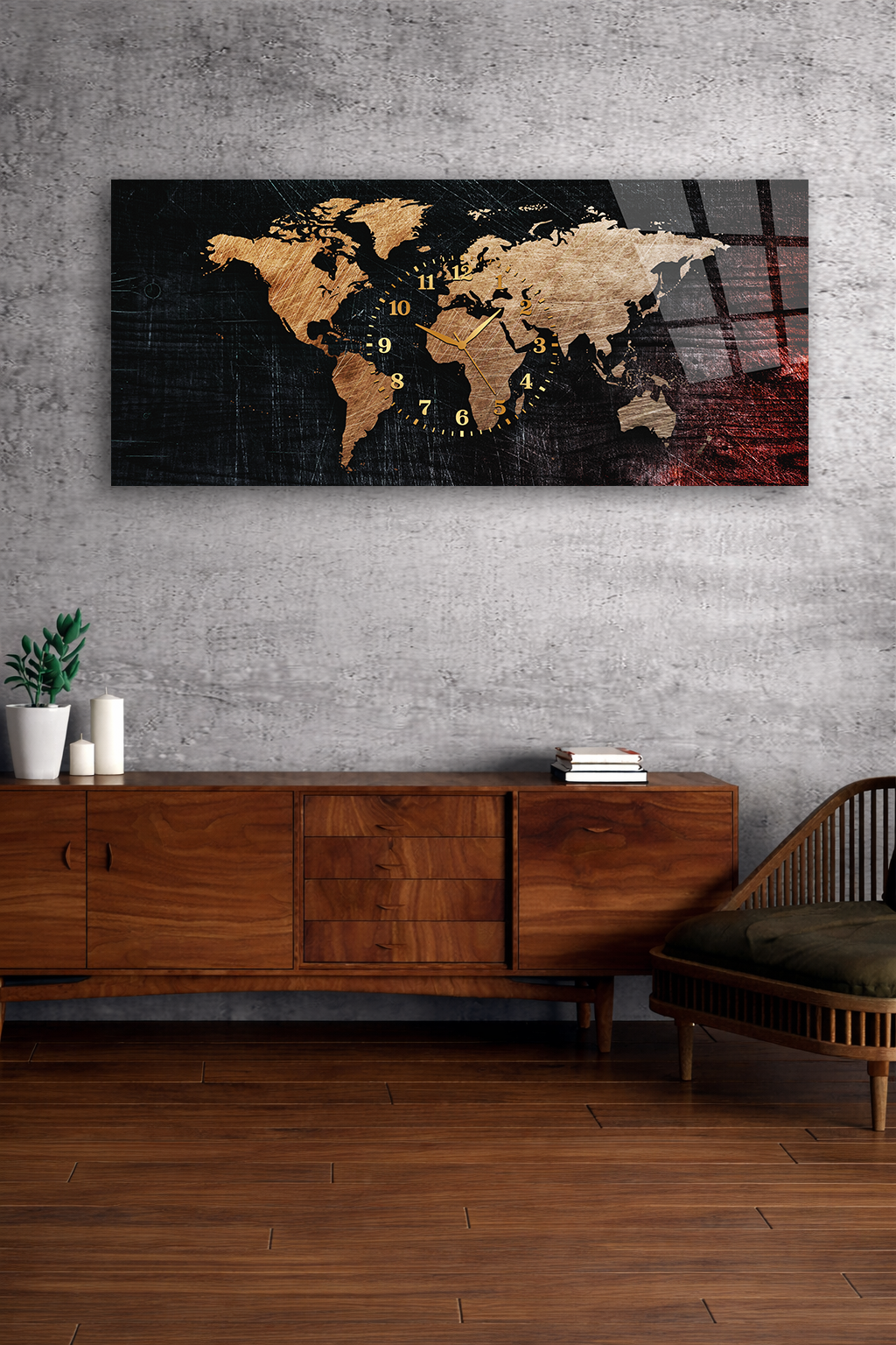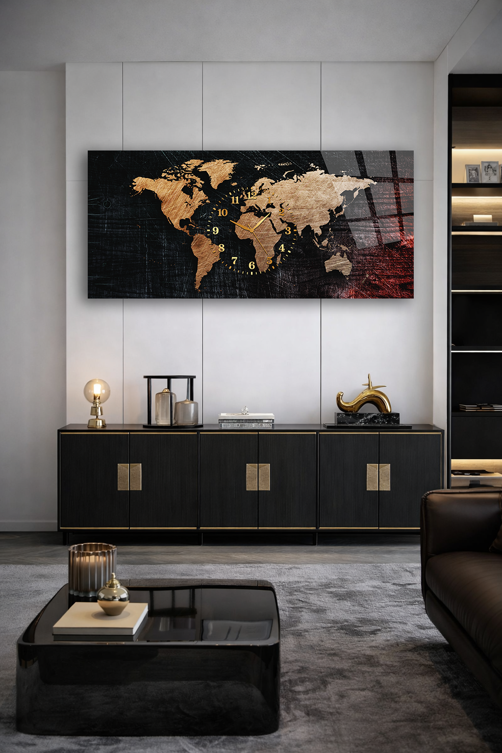 KIRILMAZ CAM DUVAR SAATİ , HEM TABLO HEM SAAT DÜNYA HARİTASI ALTIN TASARIM EV OFİS HEDİYESİ