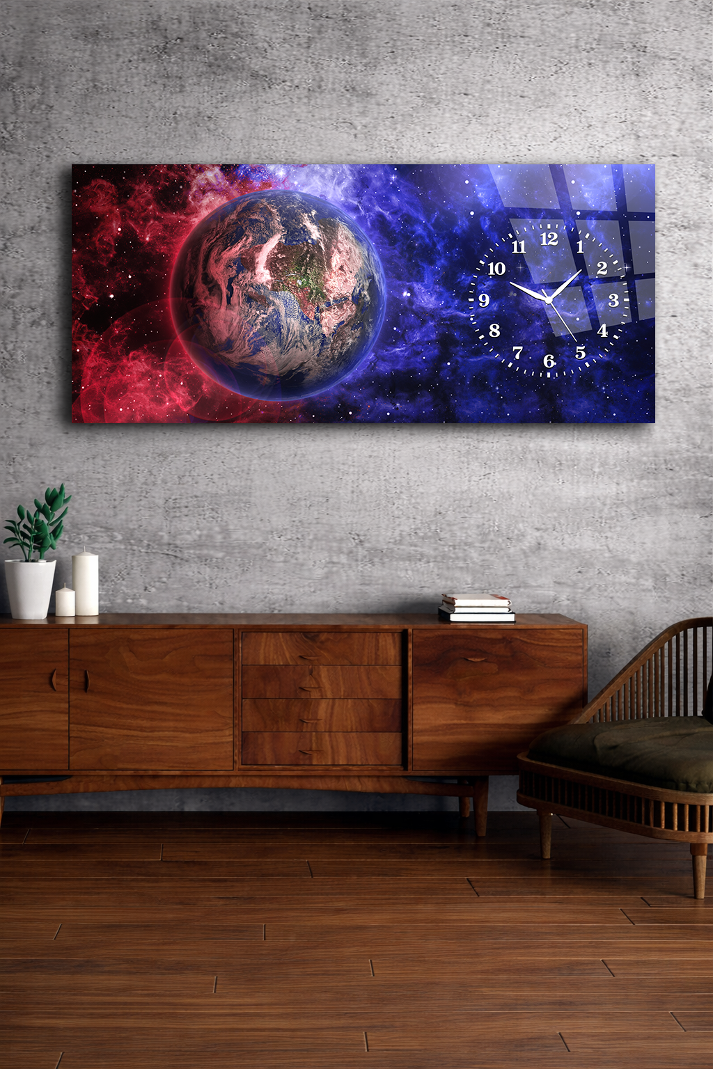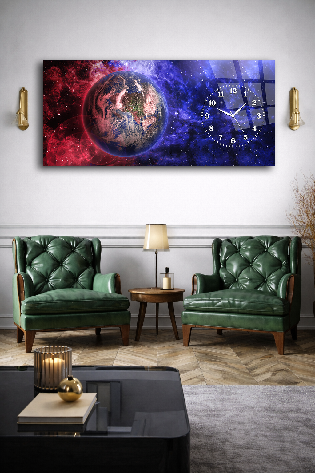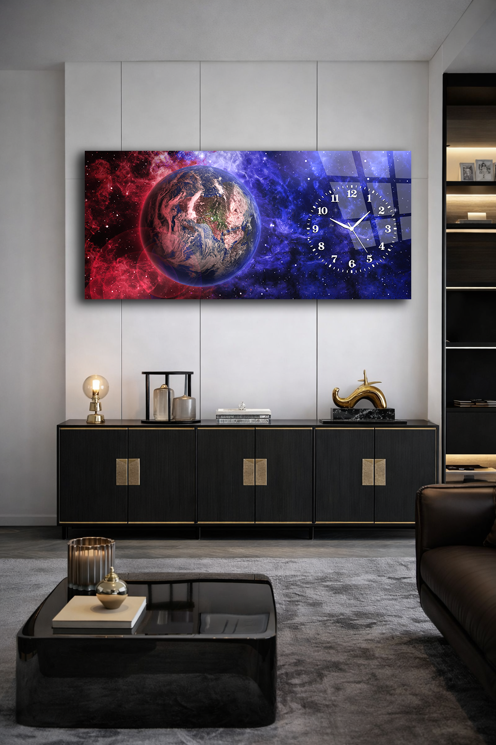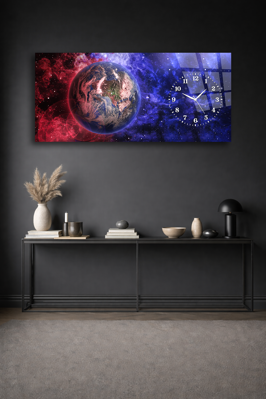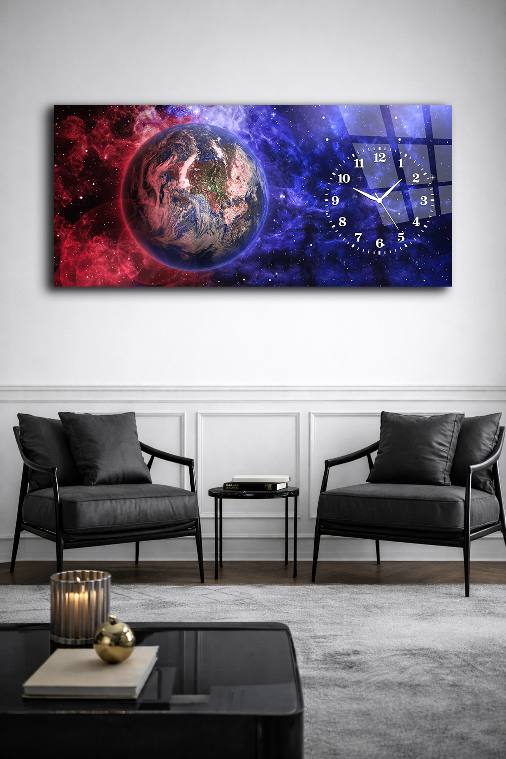 KIRILMAZ CAM DUVAR SAATİ , HEM TABLO HEM SAAT DÜNYA VE UZAY TEMALI MODERN TASARIM EV OFİS HEDİYESİ