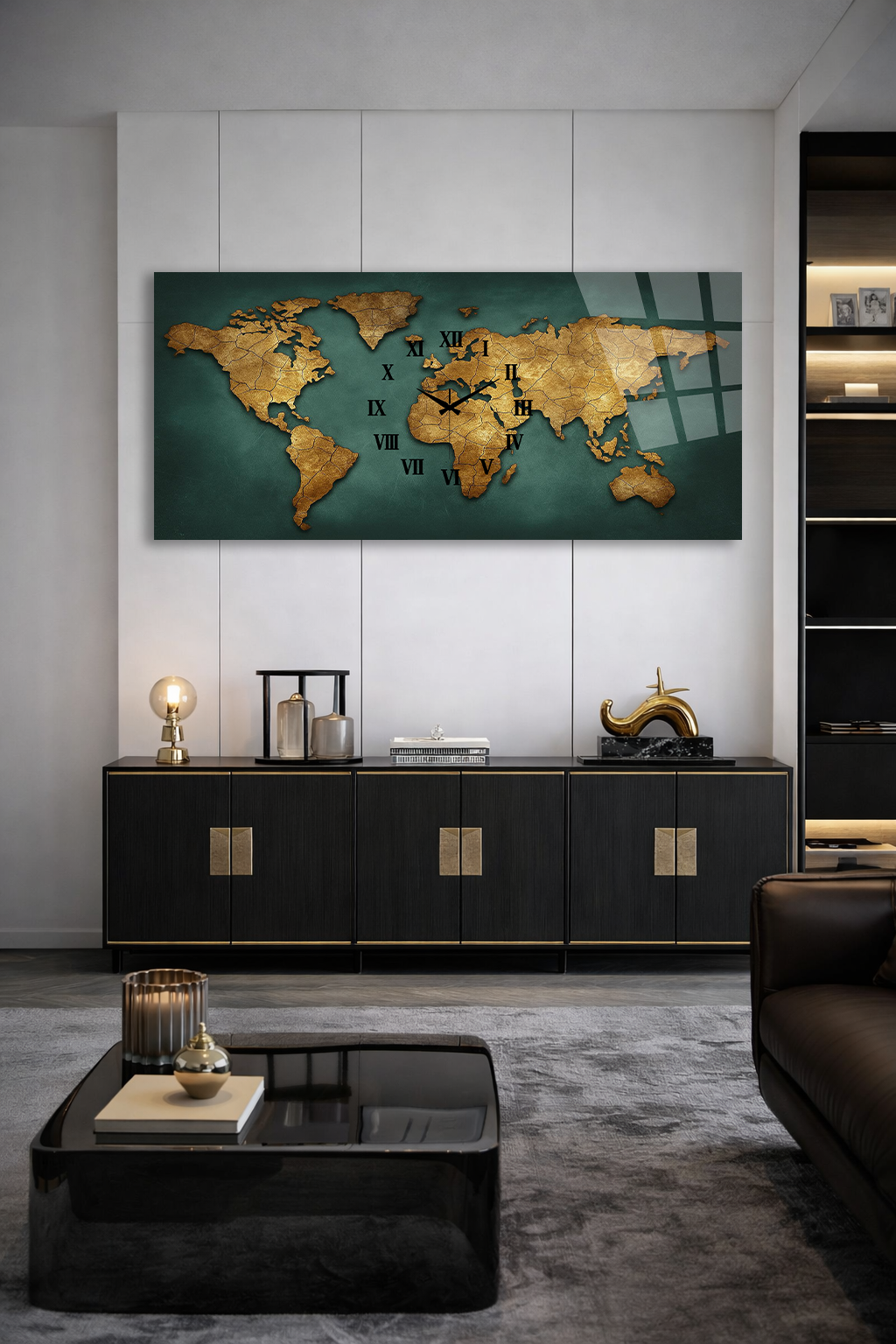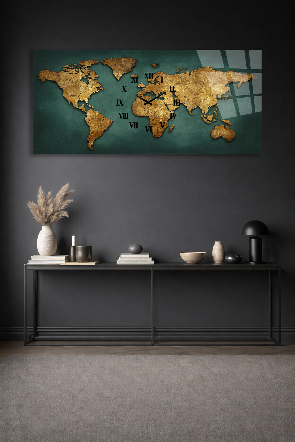 KIRILMAZ CAM DUVAR SAATİ, HEM TABLO HEM SAAT ESKİ DÜNYA HARİTASI ALTIN TON EV OFİS HEDİYESİ