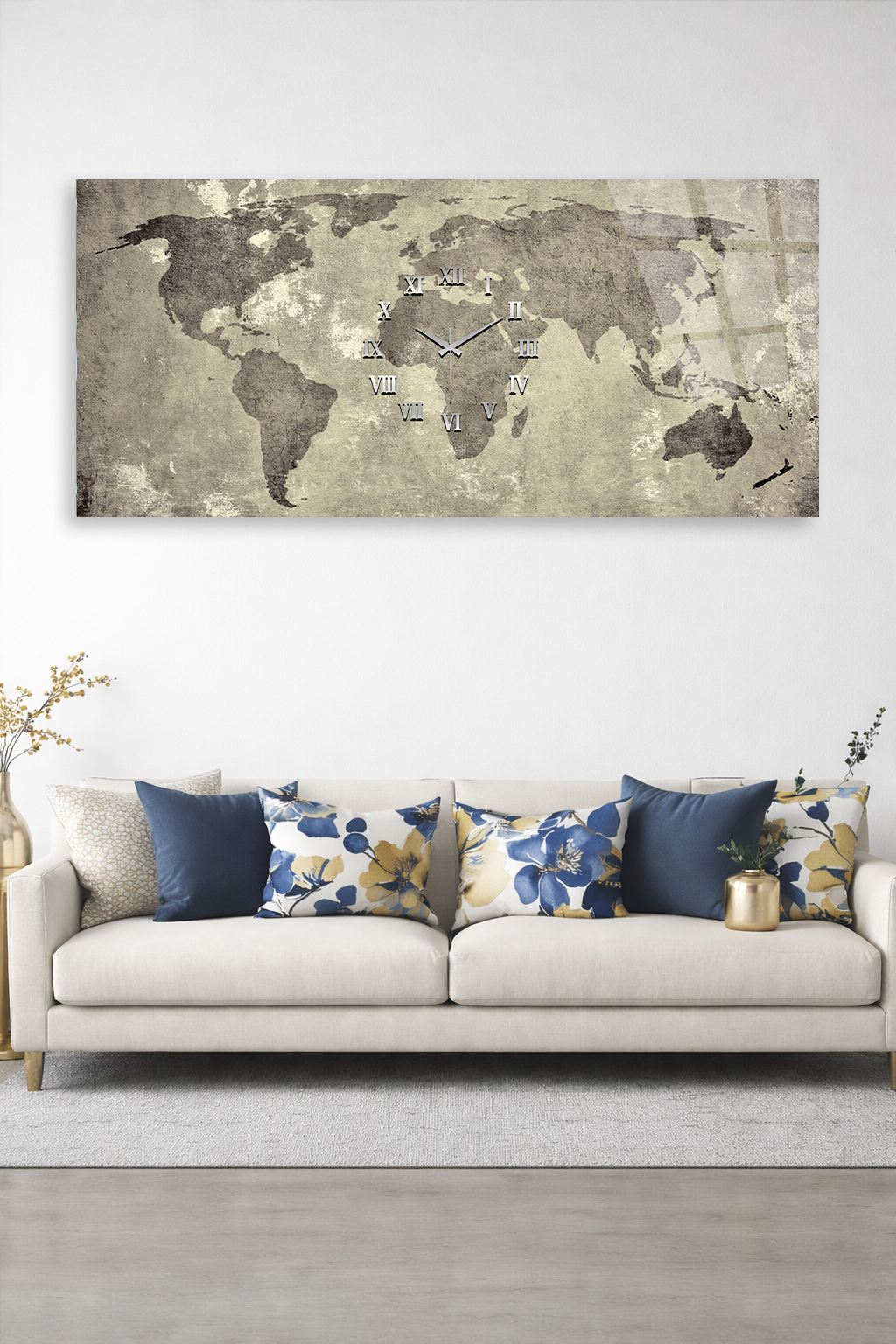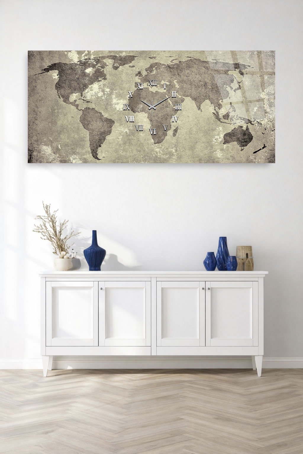 KIRILMAZ CAM DUVAR SAATİ , HEM TABLO HEM SAAT ESKİ DÜNYA HARİTASI VİNTAGE TASARIM EV OFİS HEDİYESİ