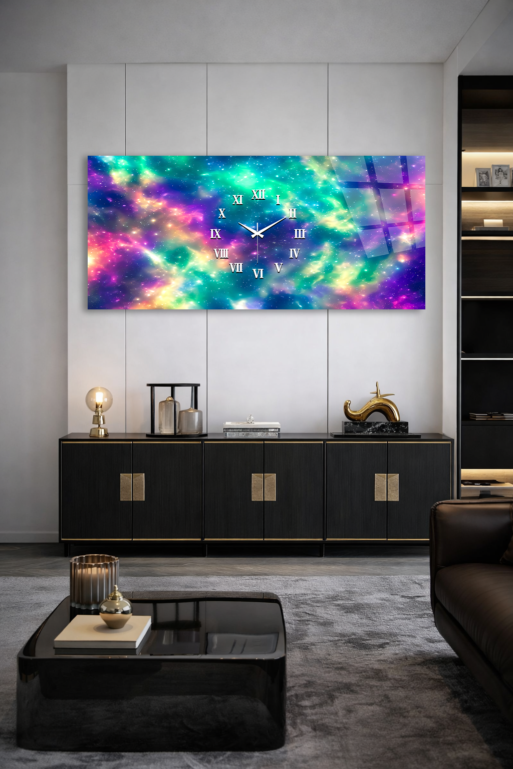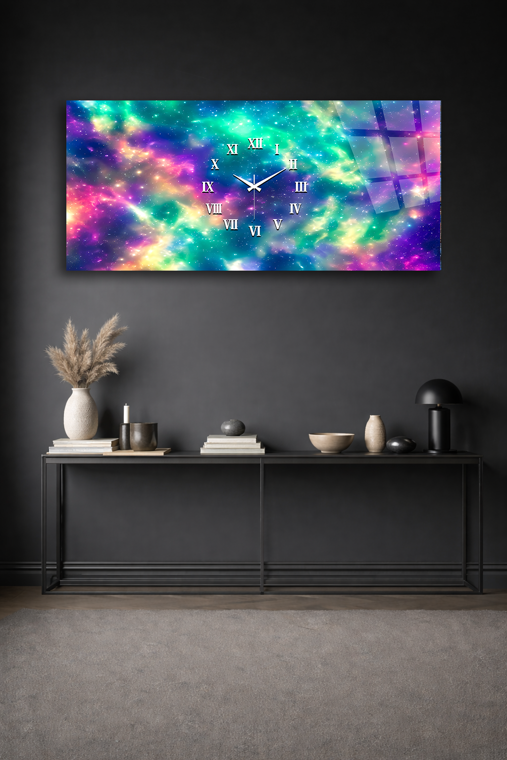 KIRILMAZ CAM DUVAR SAATİ , HEM TABLO HEM SAAT GALAKSİ KOZMİK RENKLER EV OFİS HEDİYESİ