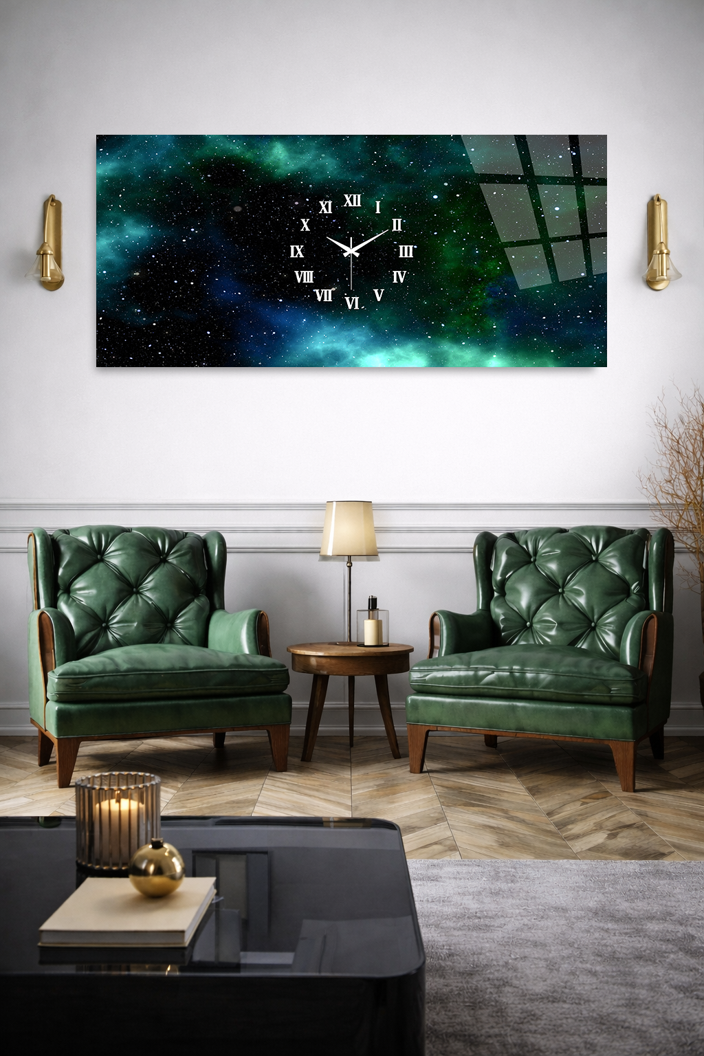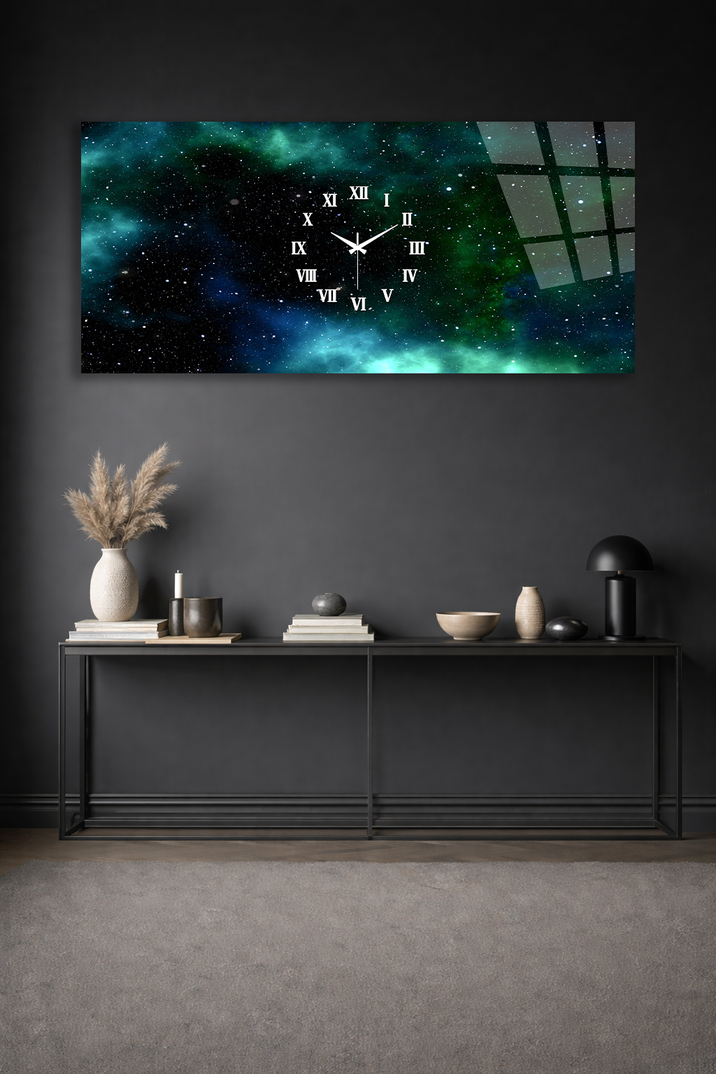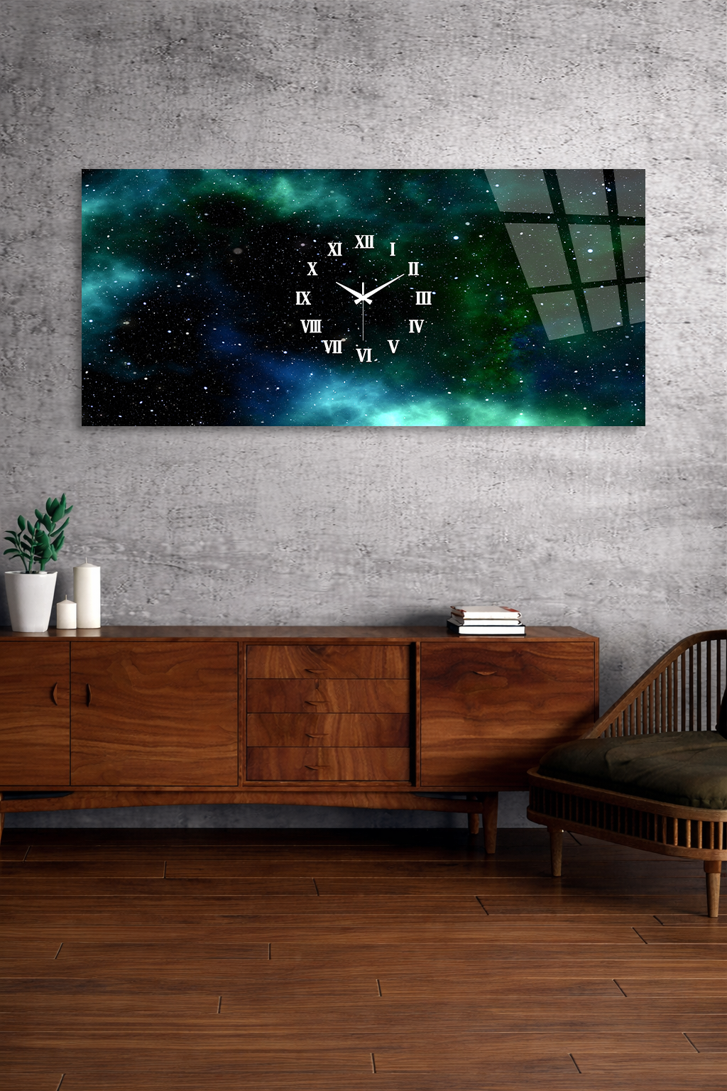 KIRILMAZ CAM DUVAR SAATİ, HEM TABLO HEM SAAT GALAKSİ UZAY TEMALI EV OFİS HEDİYESİ