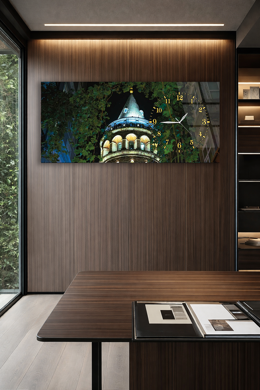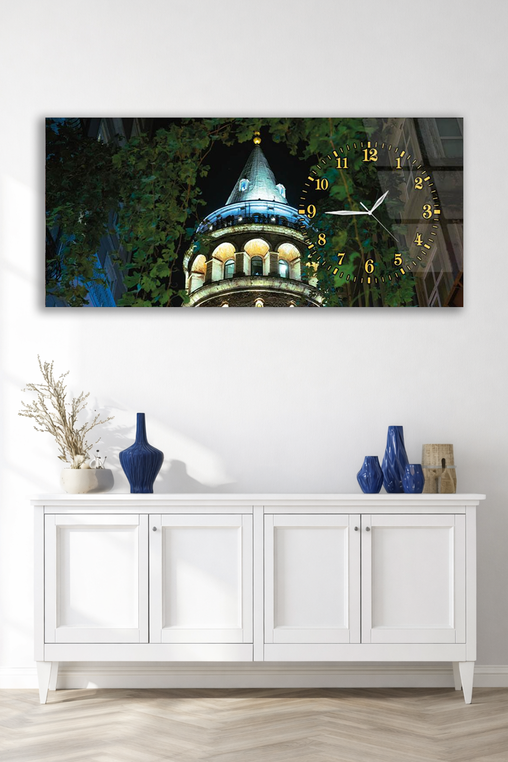 KIRILMAZ CAM DUVAR SAATİ , HEM TABLO HEM SAAT GALATA KULESİ GECE MANZARASI EV OFİS HEDİYESİ