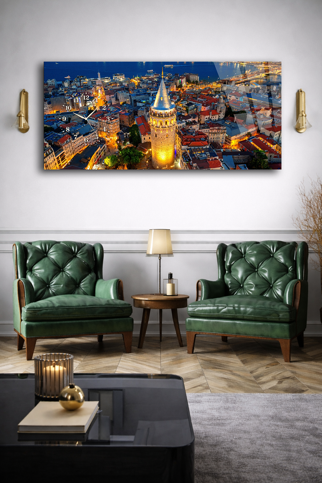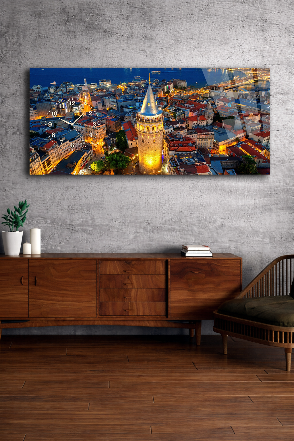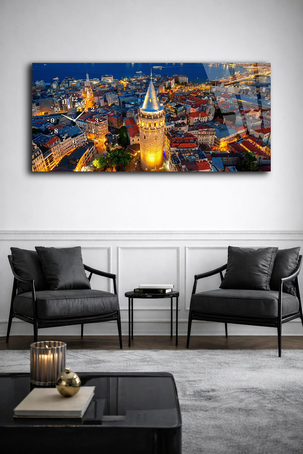 KIRILMAZ CAM DUVAR SAATİ , HEM TABLO HEM SAAT GALATA KULESİ İSTANBUL GECE MANZARASI EV OFİS HEDİYESİ