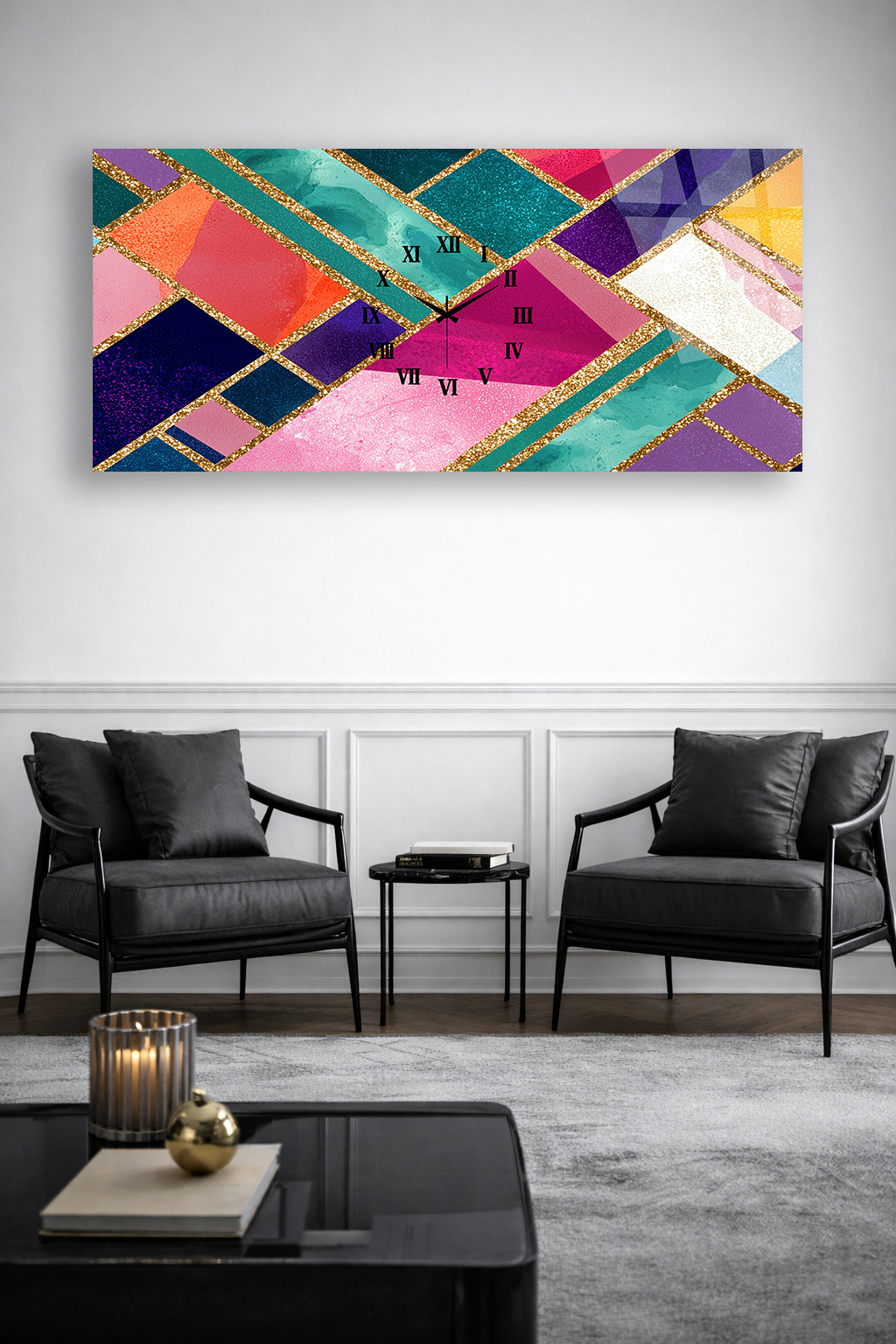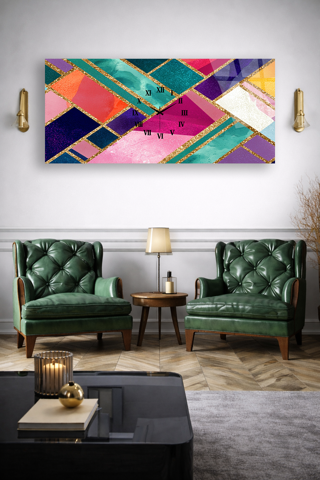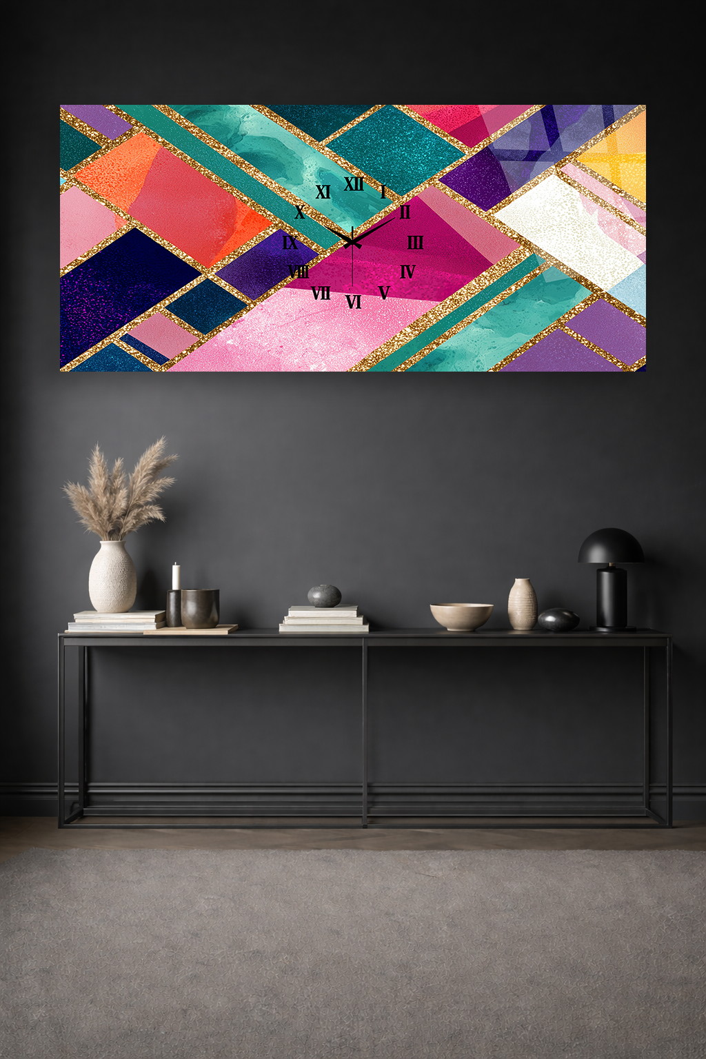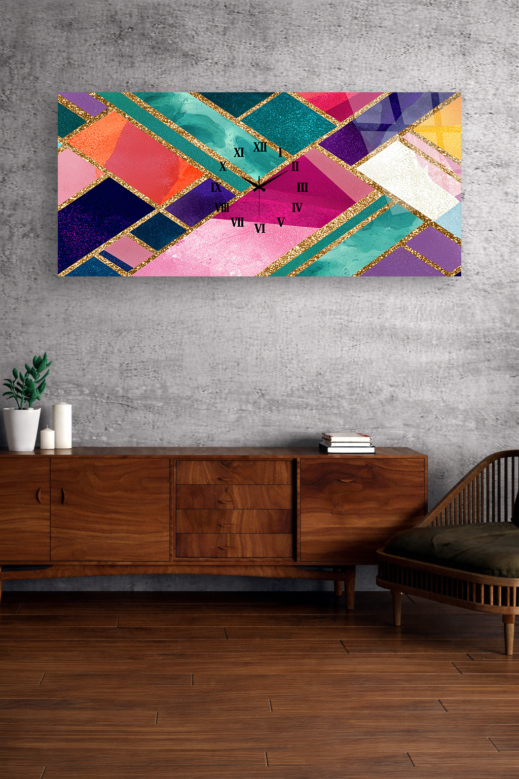 KIRILMAZ CAM DUVAR SAATİ , HEM TABLO HEM SAAT GEOMETRİK RENKLİ MODERN EV OFİS HEDİYESİ
