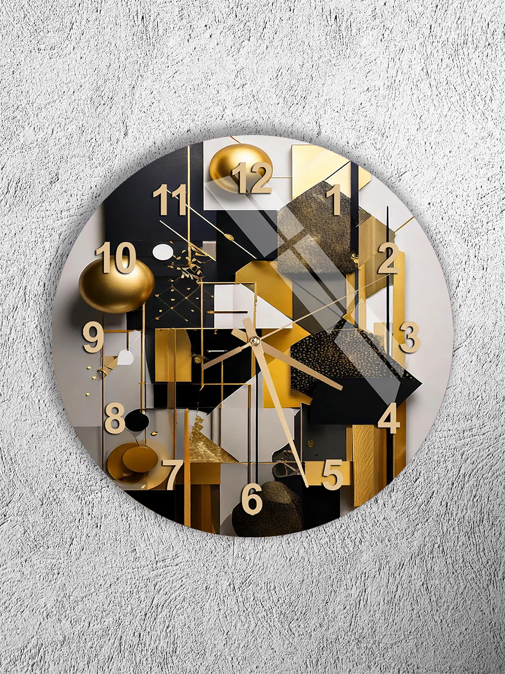 KIRILMAZ CAM DUVAR SAATİ, HEM TABLO HEM SAAT GEOMETRİK SİYAH ALTIN MODERN DEKOR TASARIM EV OFİS HEDİYESİ