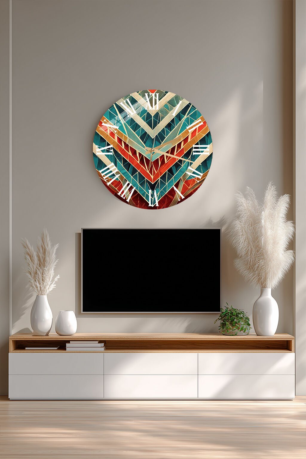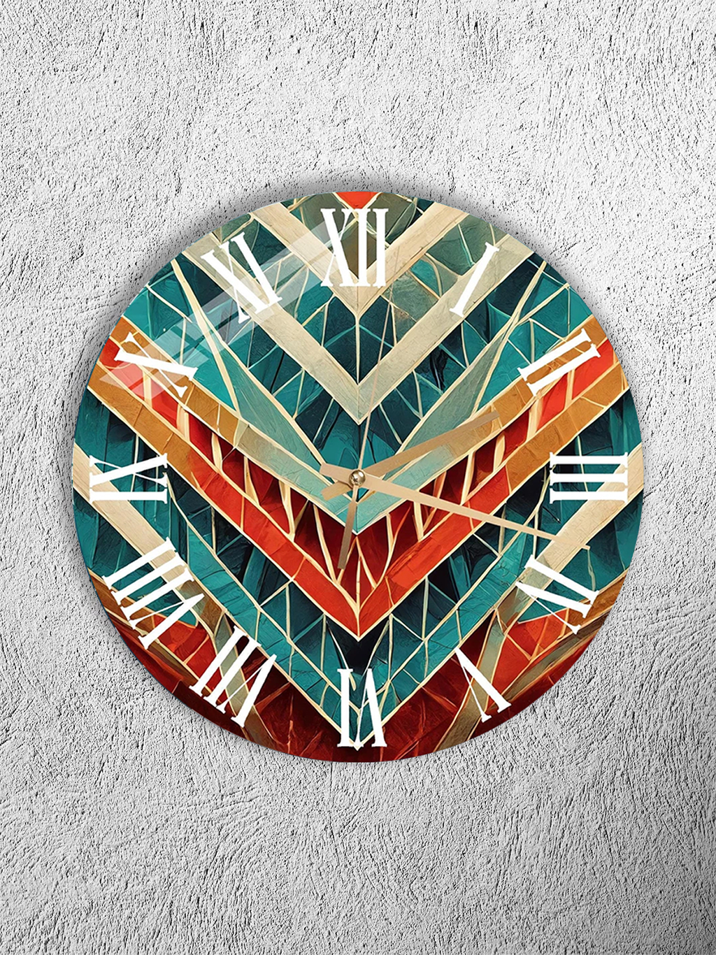KIRILMAZ CAM DUVAR SAATİ, HEM TABLO HEM SAAT GEOMETRİK V DESEN TURKUAZ KIRMIZI EV OFİS HEDİYESİ