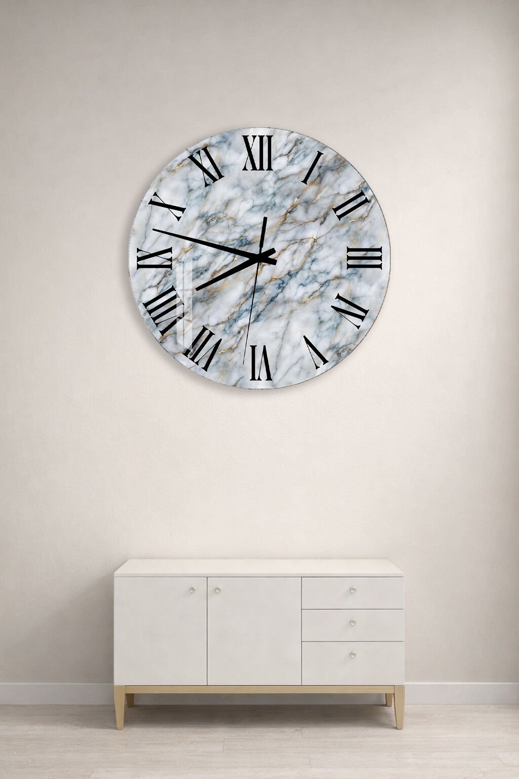 KIRILMAZ CAM DUVAR SAATİ, HEM TABLO HEM SAAT GRİ MERMER ALTIN ÇATLAK ROMEN RAKAM EV OFİS HEDİYESİ