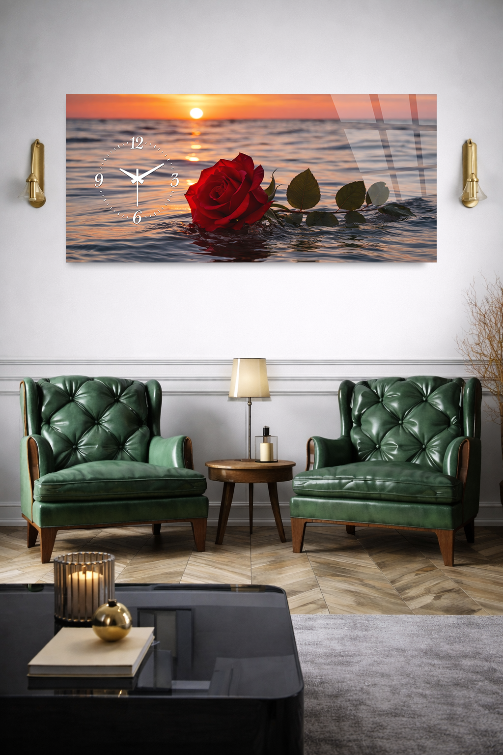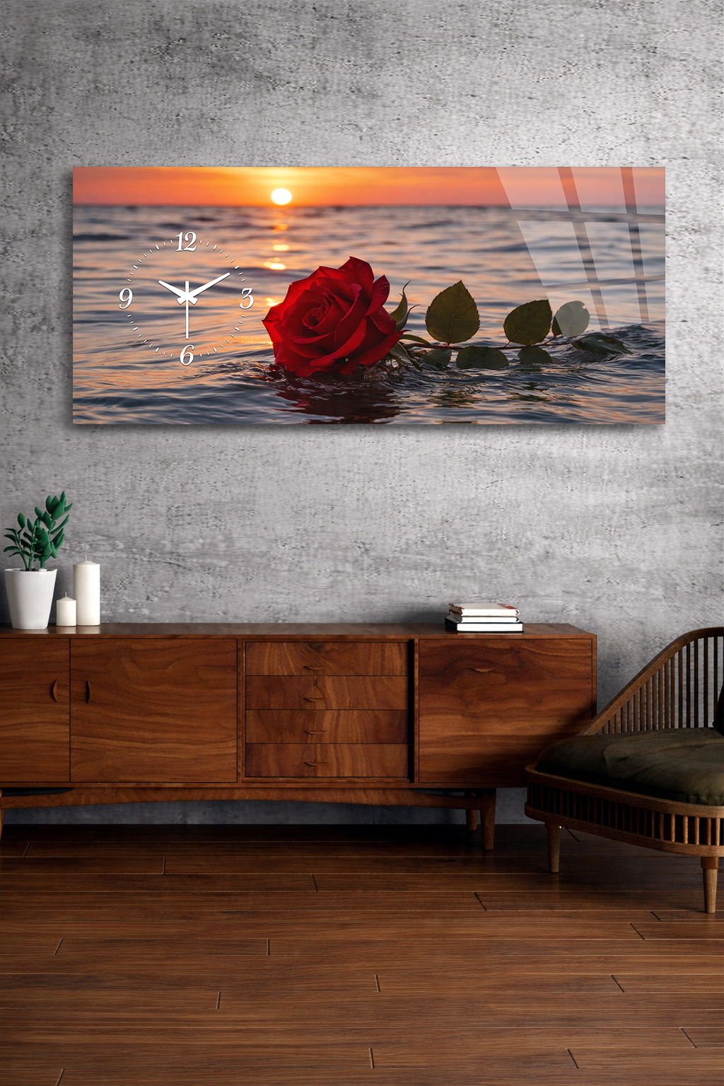 KIRILMAZ CAM DUVAR SAATİ , HEM TABLO HEM SAAT GÜL VE GÜN BATIMI MANZARASI EV OFİS HEDİYESİ