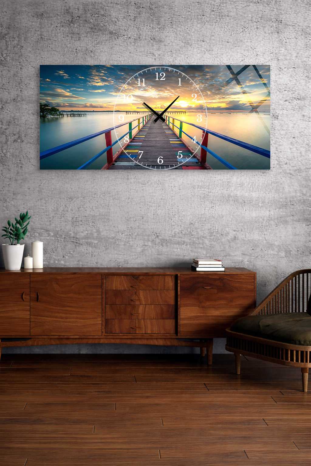 KIRILMAZ CAM DUVAR SAATİ , HEM TABLO HEM SAAT GÜN BATIMI İSKELE MANZARALI CAM SAAT EV OFİS HEDİYESİ