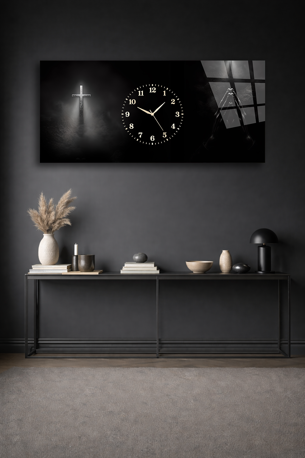 KIRILMAZ CAM DUVAR SAATİ , HEM TABLO HEM SAAT HAÇ VE SİYAH FONLU MİNİMAL TASARIM EV OFİS HEDİYESİ