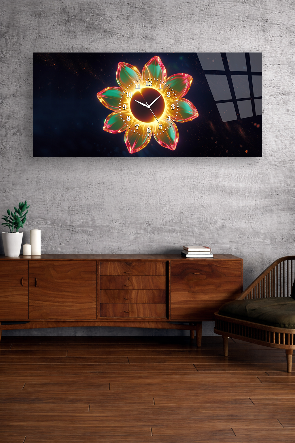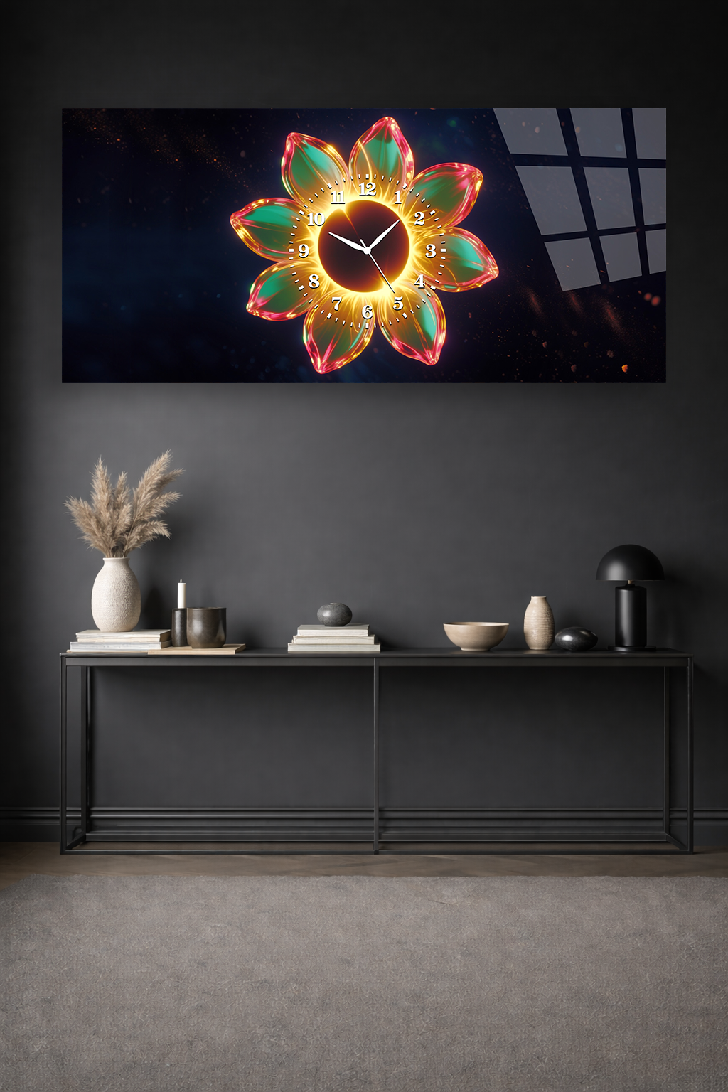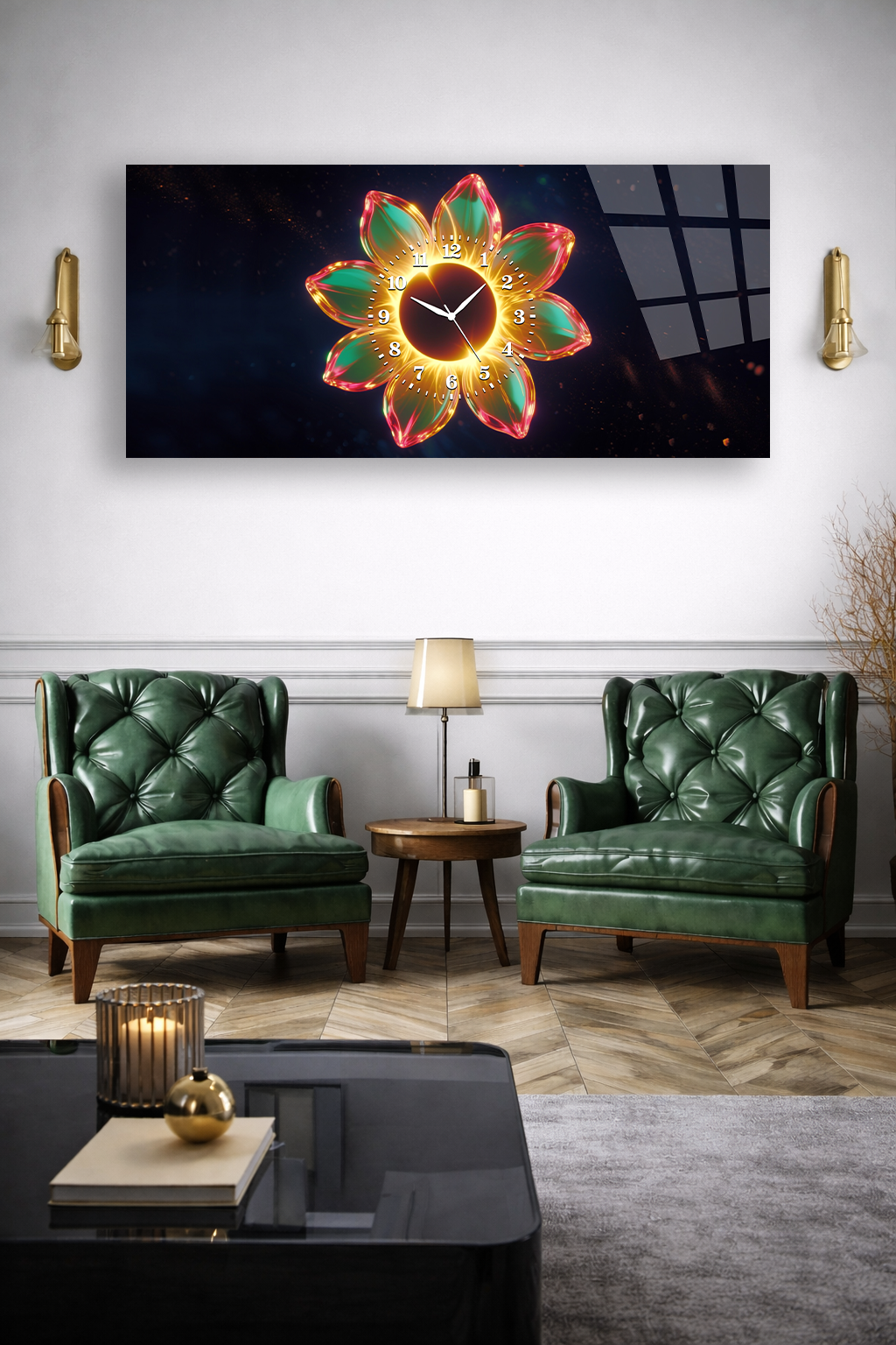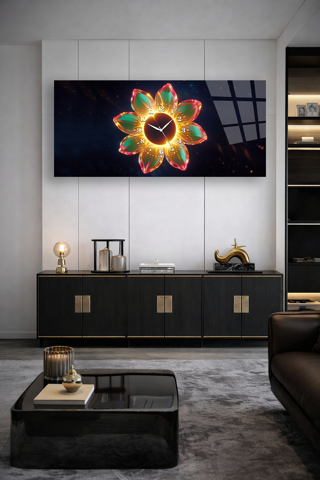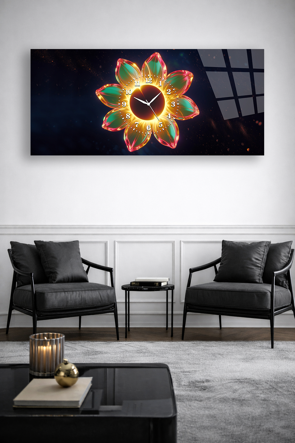 KIRILMAZ CAM DUVAR SAATİ, HEM TABLO HEM SAAT IŞIKLI ÇİÇEK FÜTÜRİSTİK TASARIM EV OFİS HEDİYESİ