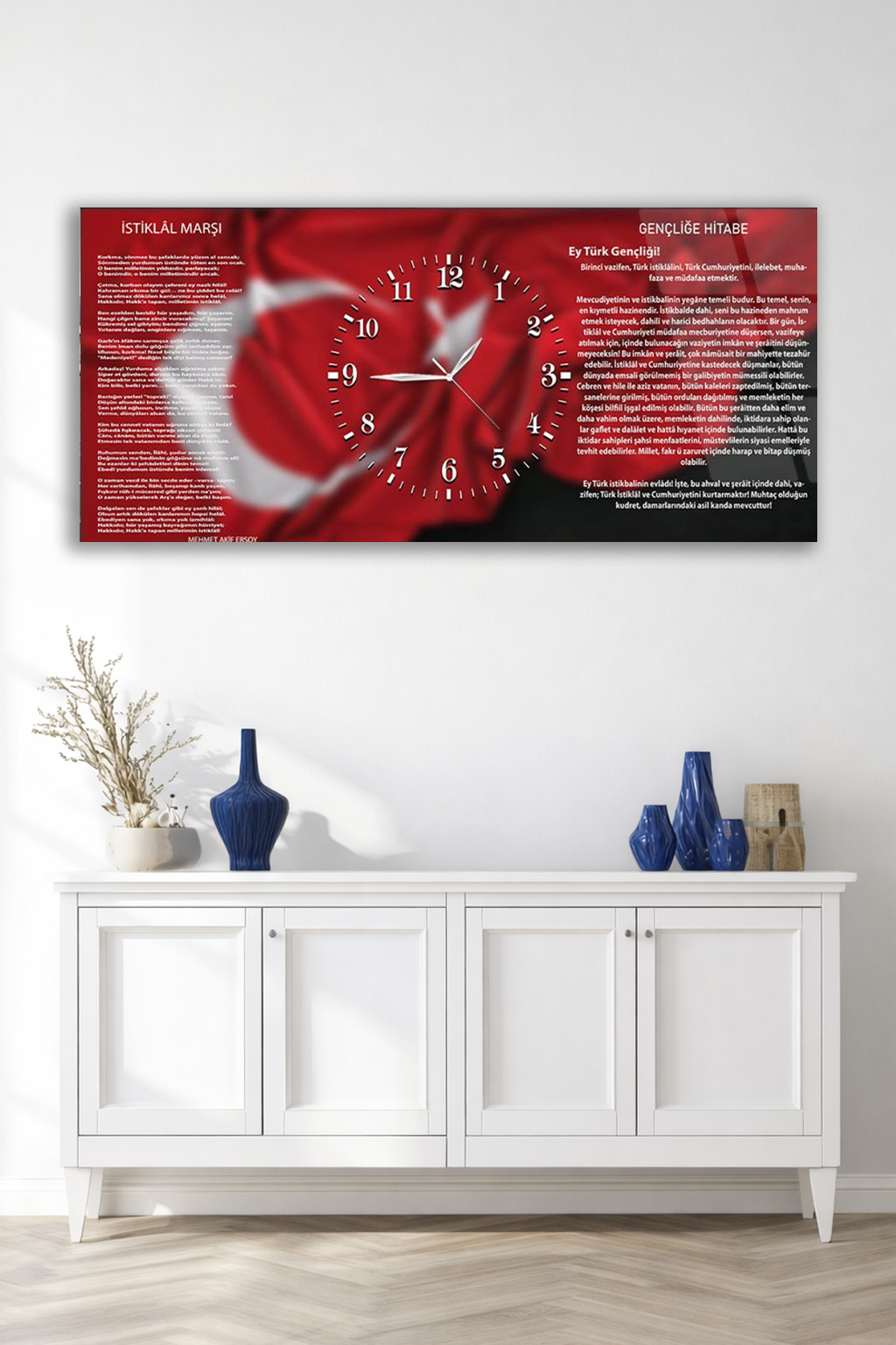 KIRILMAZ CAM DUVAR SAATİ , HEM TABLO HEM SAAT İSTİKLAL MARŞI YAZILI ATATÜRK TEMALI EV OFİS HEDİYESİ