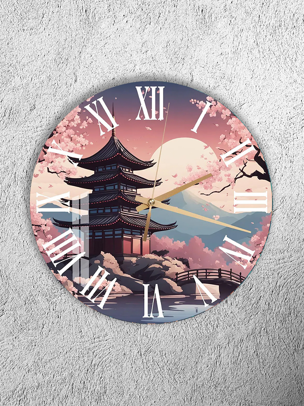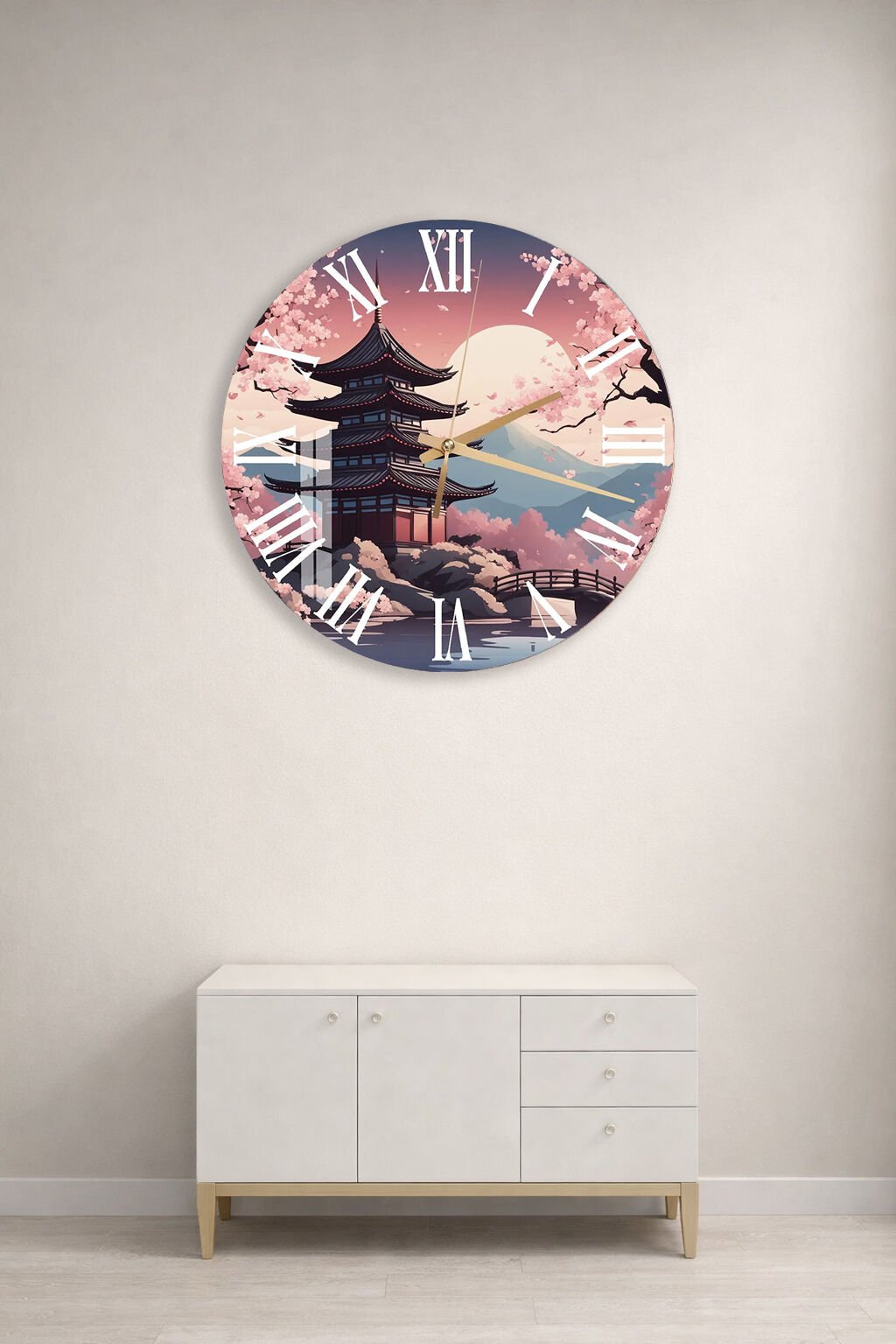 KIRILMAZ CAM DUVAR SAATİ, HEM TABLO HEM SAAT JAPON TAPINAĞI SAKURA MANZARA EV OFİS HEDİYESİ