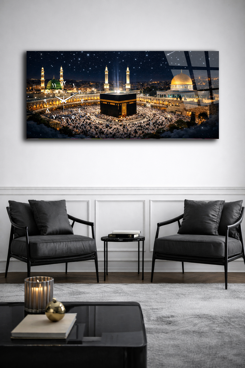 KIRILMAZ CAM DUVAR SAATİ , HEM TABLO HEM SAAT KÂBE GECE MANZARASI EV OFİS HEDİYESİ
