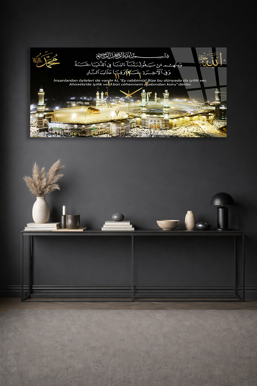 KIRILMAZ CAM DUVAR SAATİ , HEM TABLO HEM SAAT KABE VE AYETLİ İSLAMİ PANORAMA EV OFİS HEDİYESİ