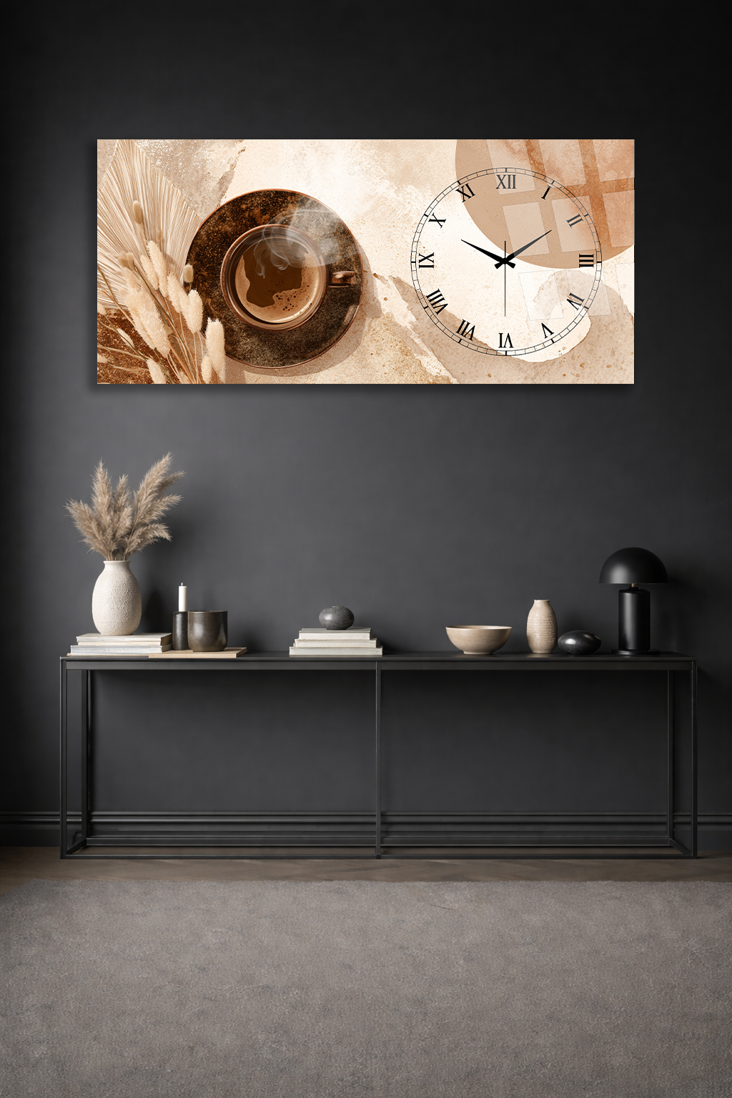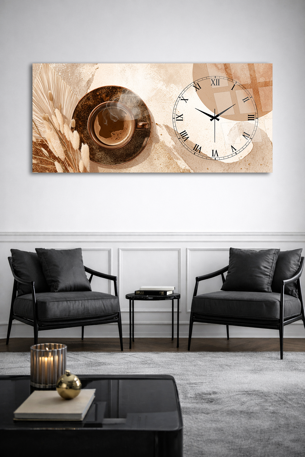 KIRILMAZ CAM DUVAR SAATİ , HEM TABLO HEM SAAT KAHVE TEMALI TASARIM EV OFİS HEDİYESİ