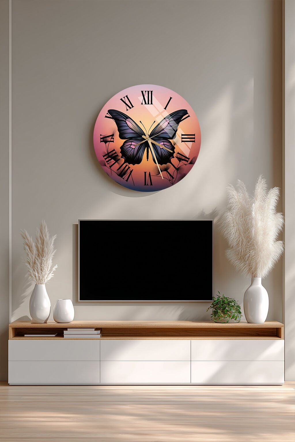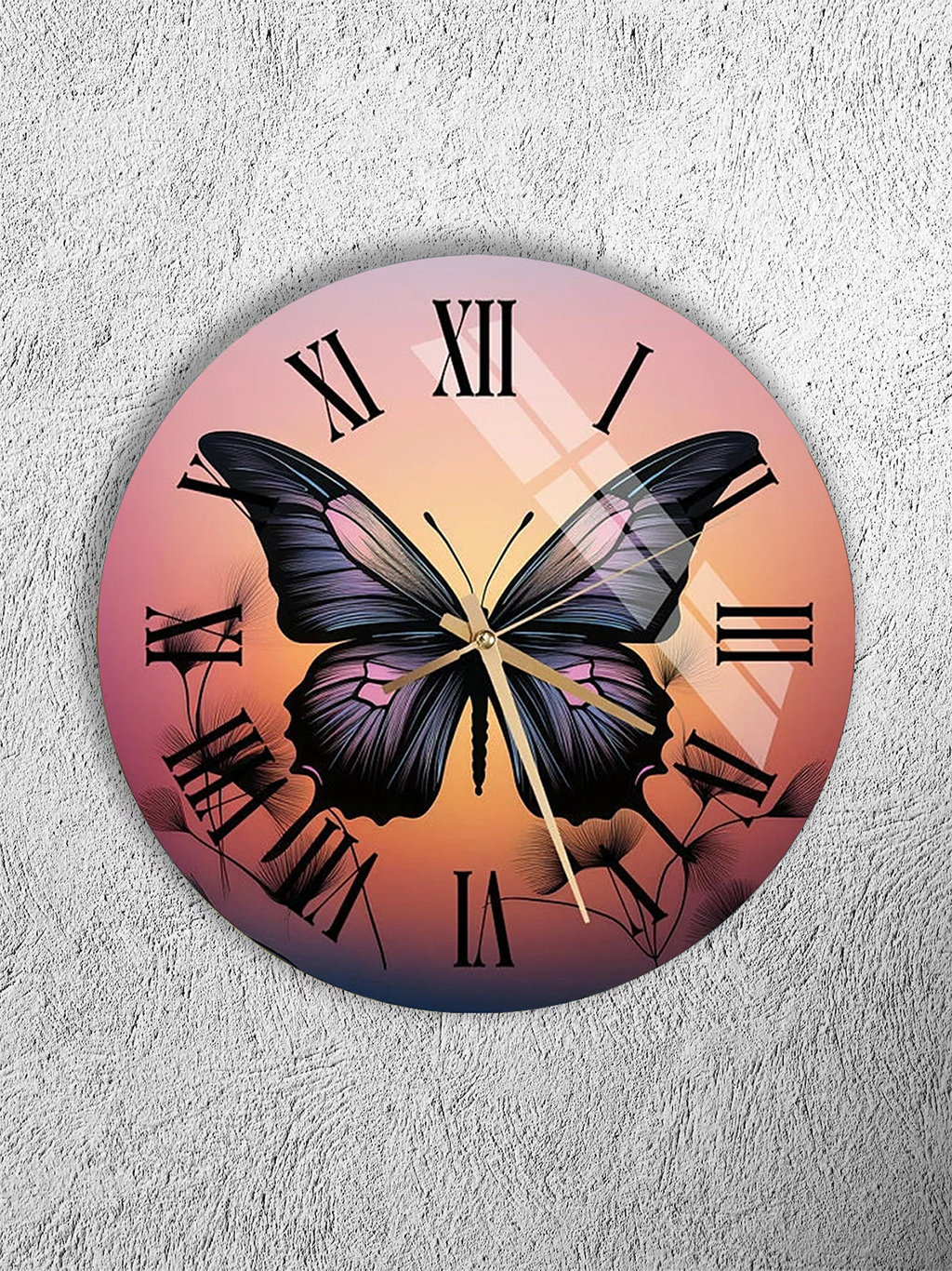 KIRILMAZ CAM DUVAR SAATİ , HEM TABLO HEM SAAT KELEBEK VE GÜN BATIMI SANATSAL TASARIM EV OFİS HEDİYESİ 317.