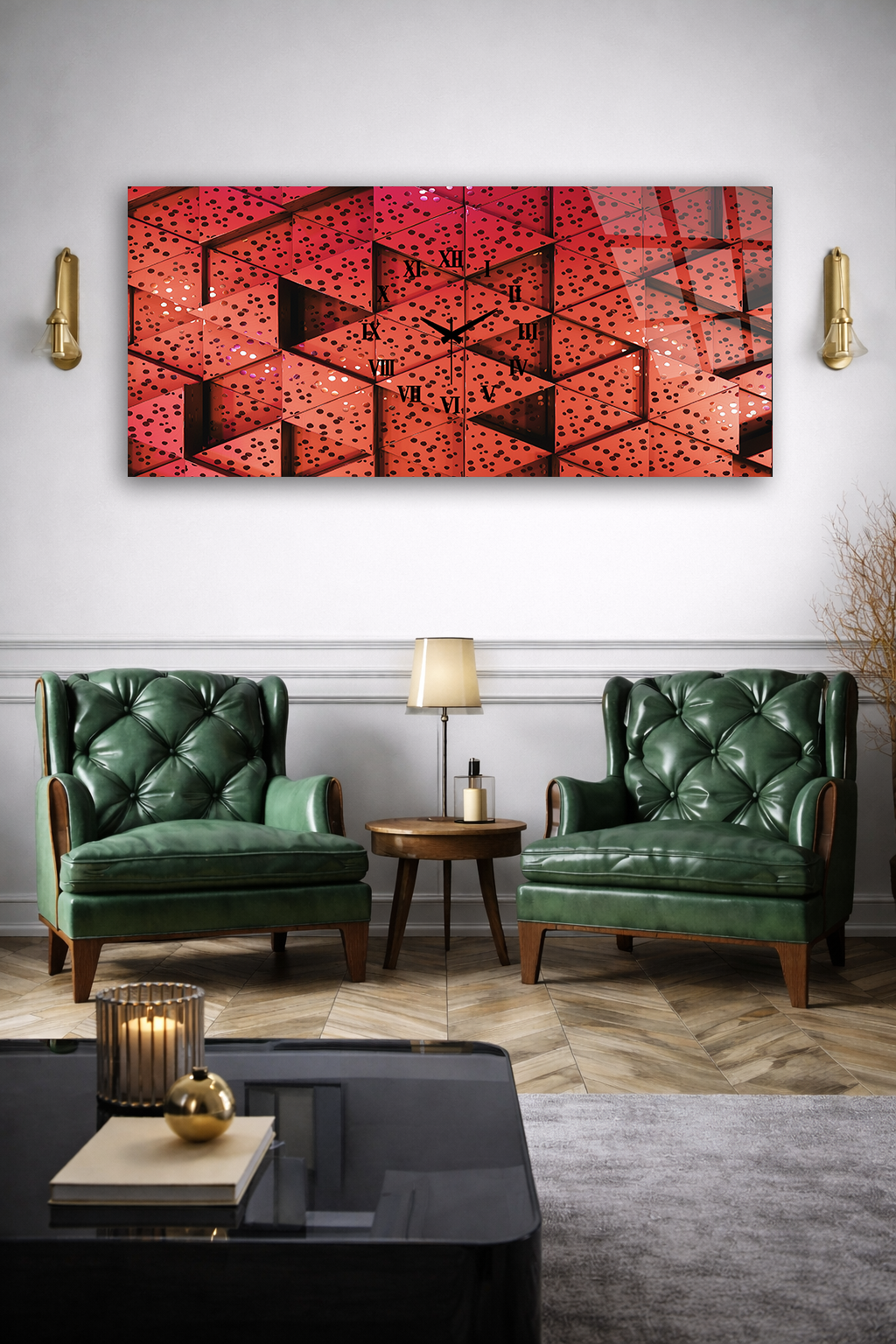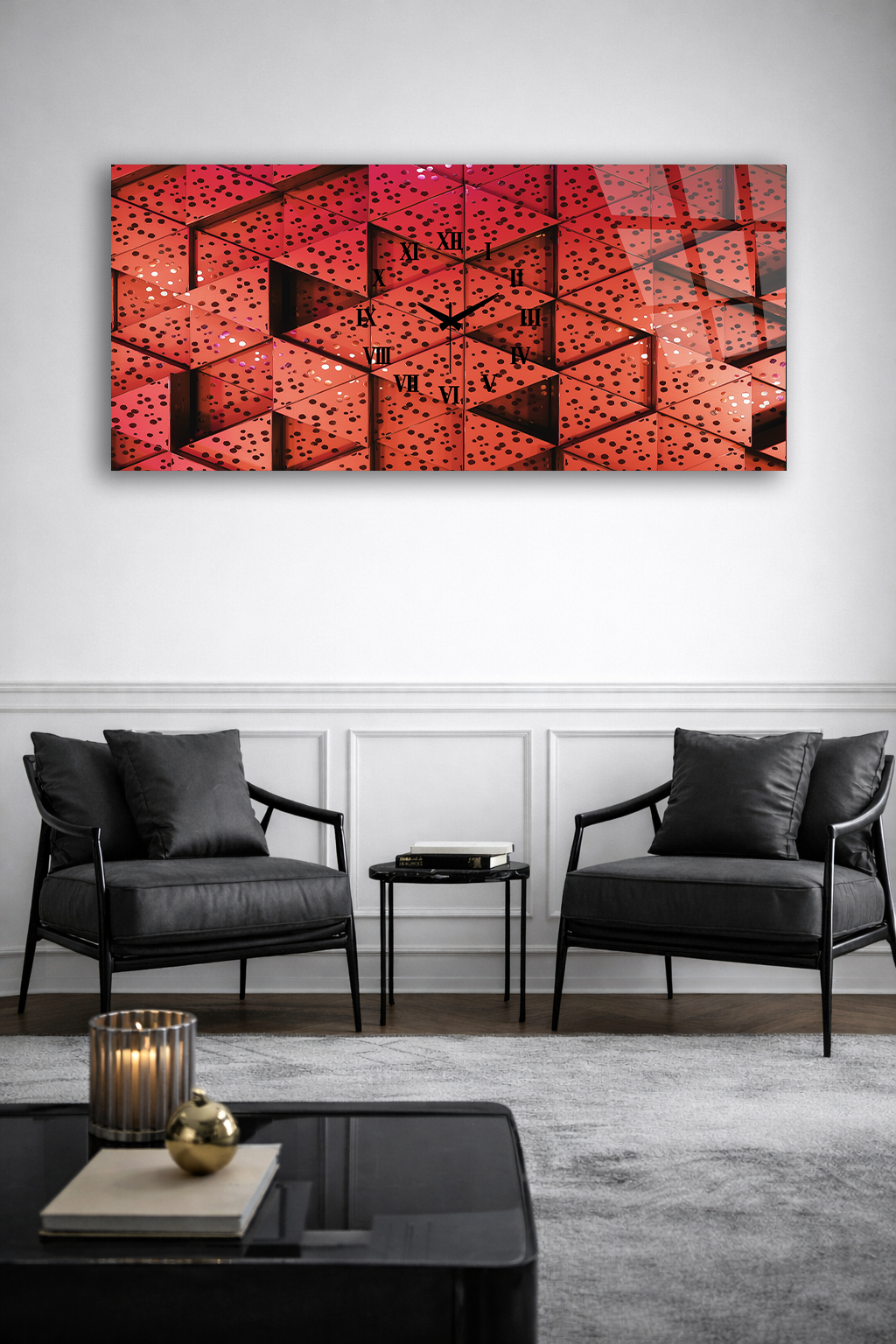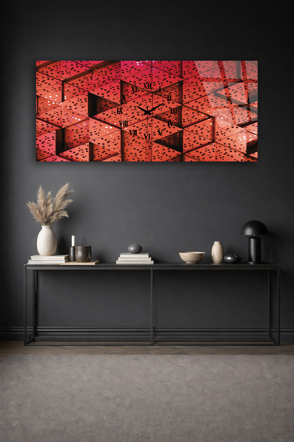 KIRILMAZ CAM DUVAR SAATİ , HEM TABLO HEM SAAT KIRMIZI GEOMETRİK SOYUT DESEN EV OFİS HEDİYESİ