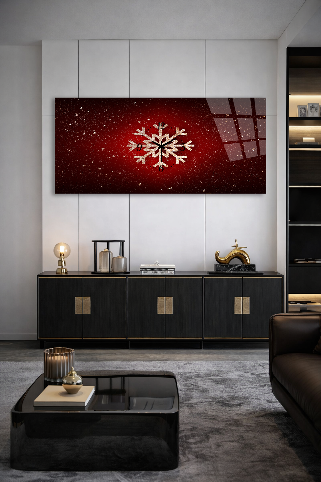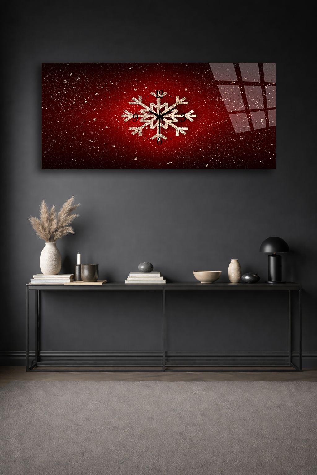 KIRILMAZ CAM DUVAR SAATİ , HEM TABLO HEM SAAT KIRMIZI KAR TANESİ KIŞ TEMASI EV OFİS HEDİYESİ