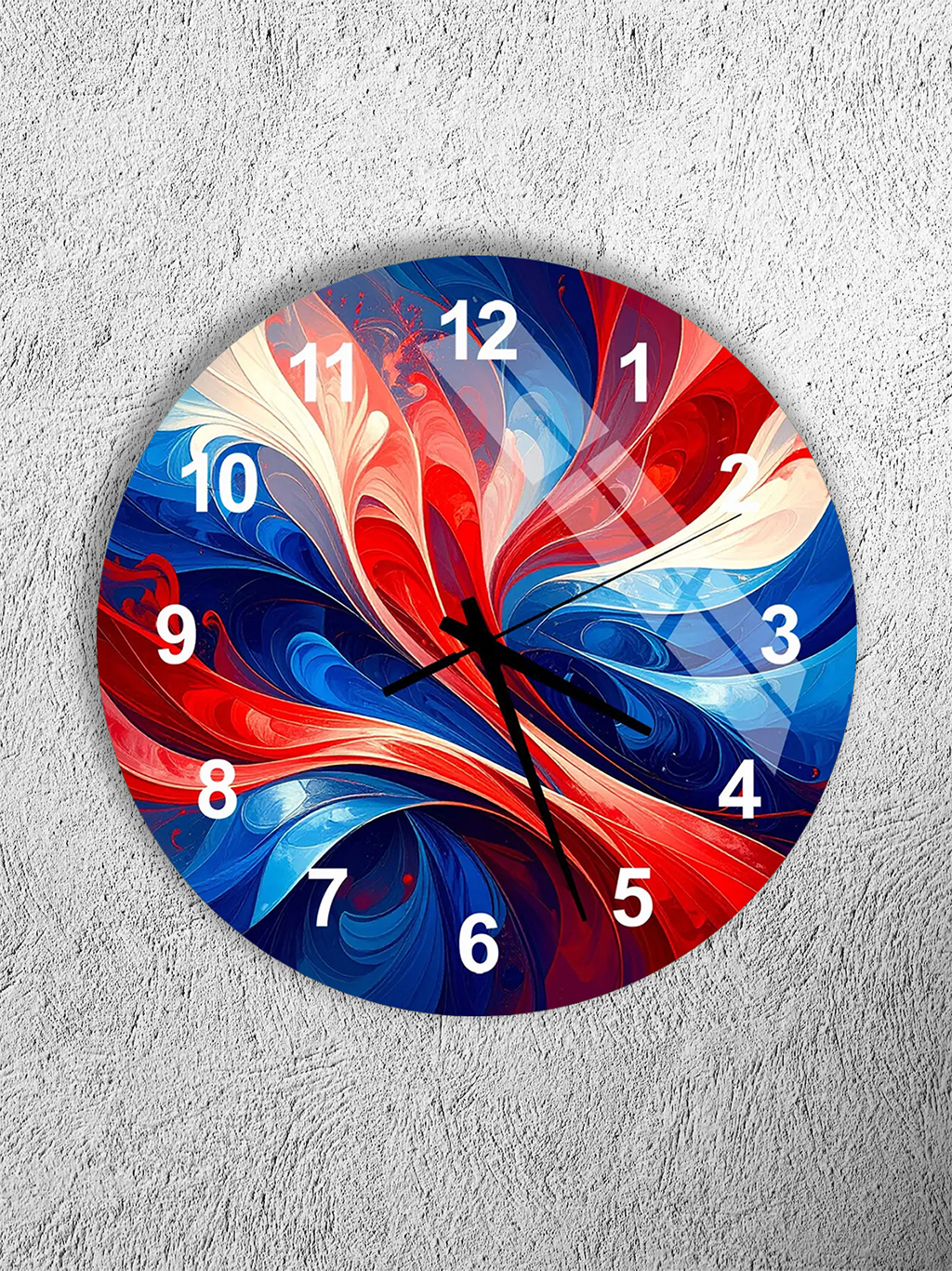 KIRILMAZ CAM DUVAR SAATİ, HEM TABLO HEM SAAT KIRMIZI MAVİ SOYUT DALGA DESEN EV OFİS HEDİYESİ