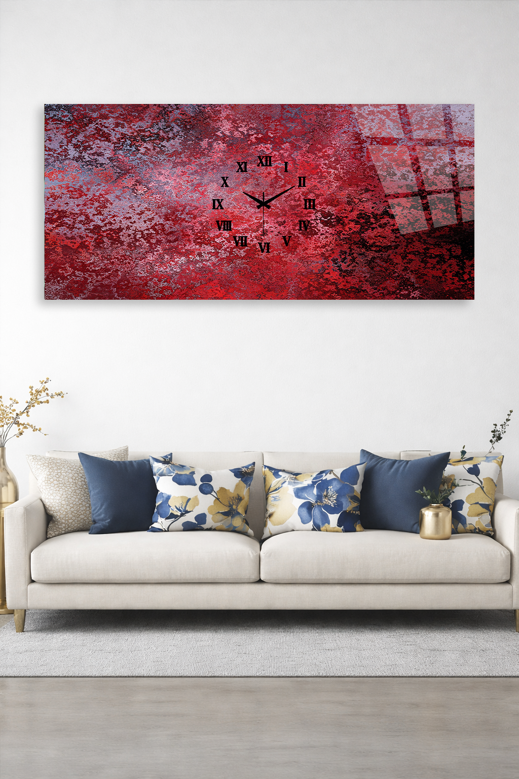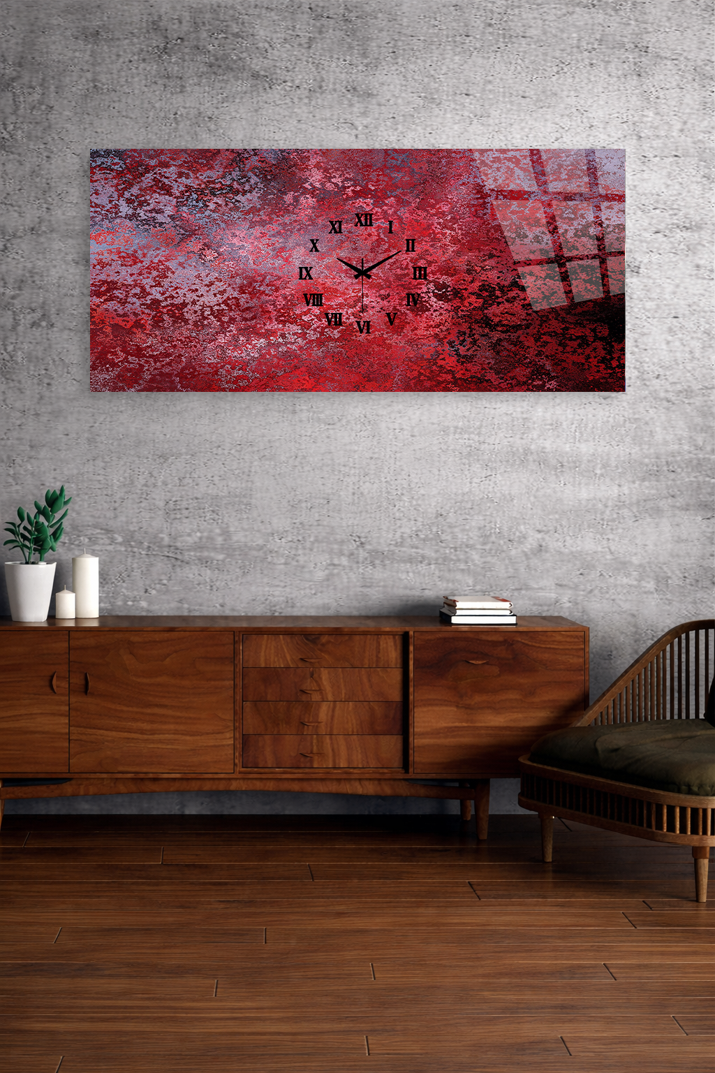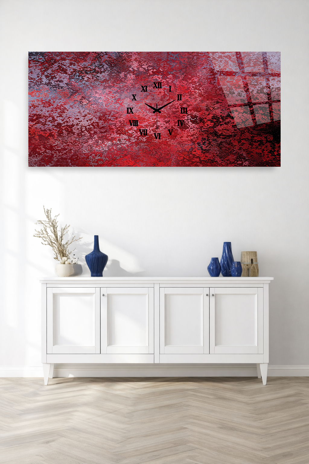 KIRILMAZ CAM DUVAR SAATİ, HEM TABLO HEM SAAT KIRMIZI SOYUT MODERN TASARIM EV OFİS HEDİYESİ