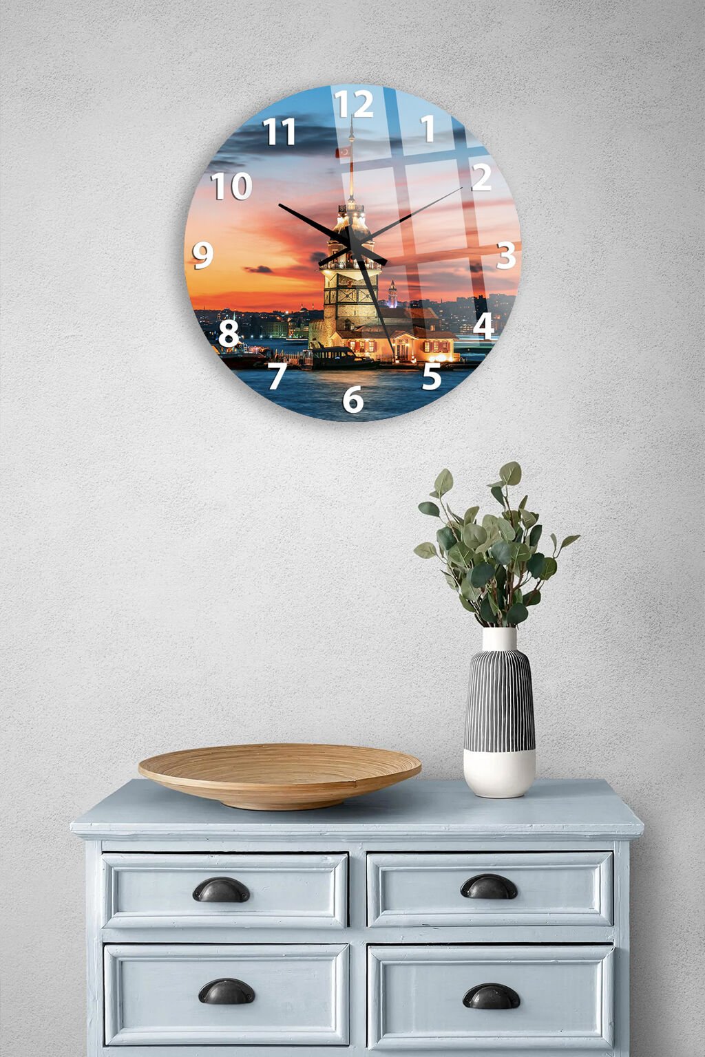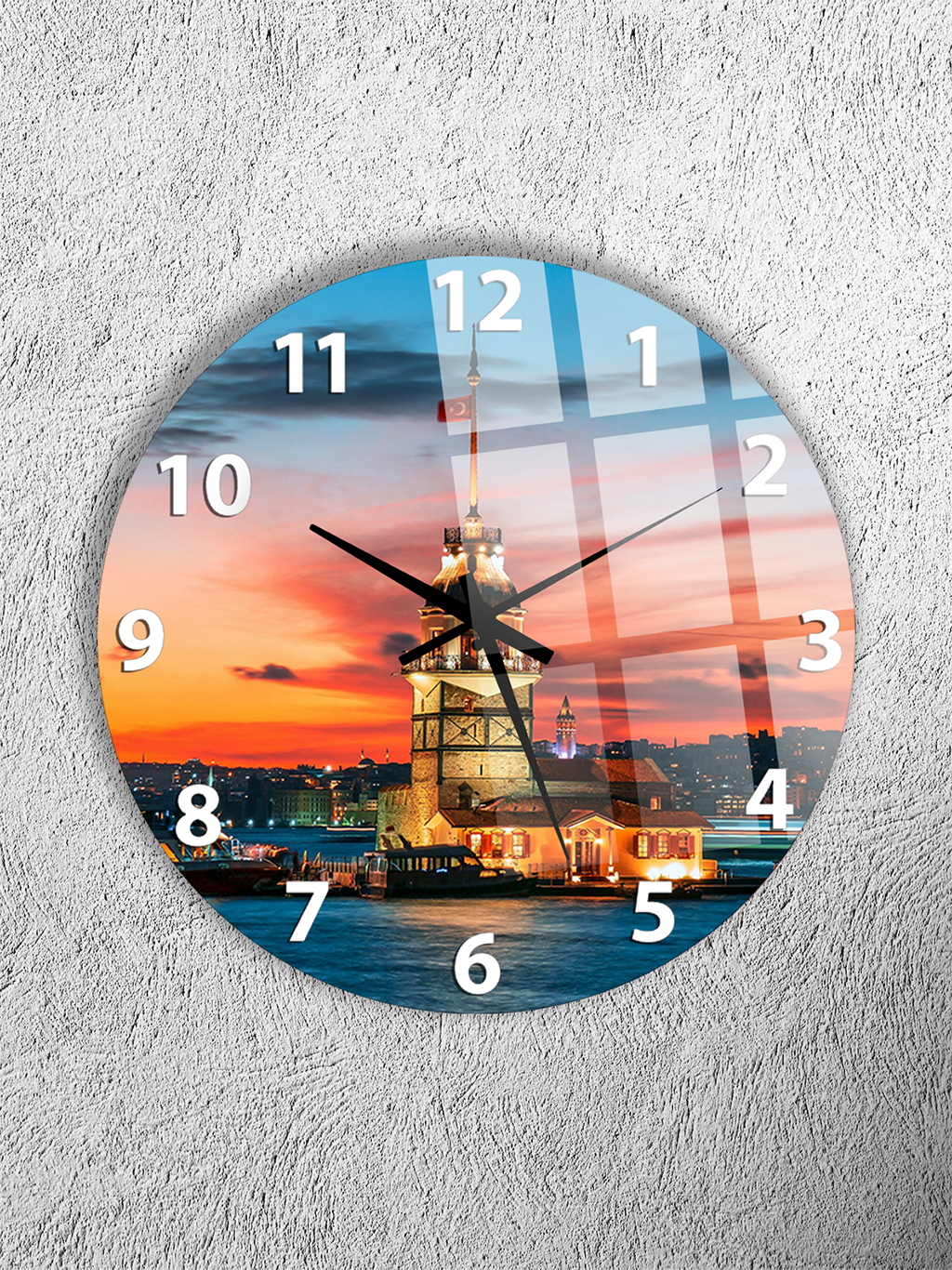 KIRILMAZ CAM DUVAR SAATİ, HEM TABLO HEM SAAT KIZ KULESİ GÜN BATIMI MANZARALI EV OFİS HEDİYESİ
