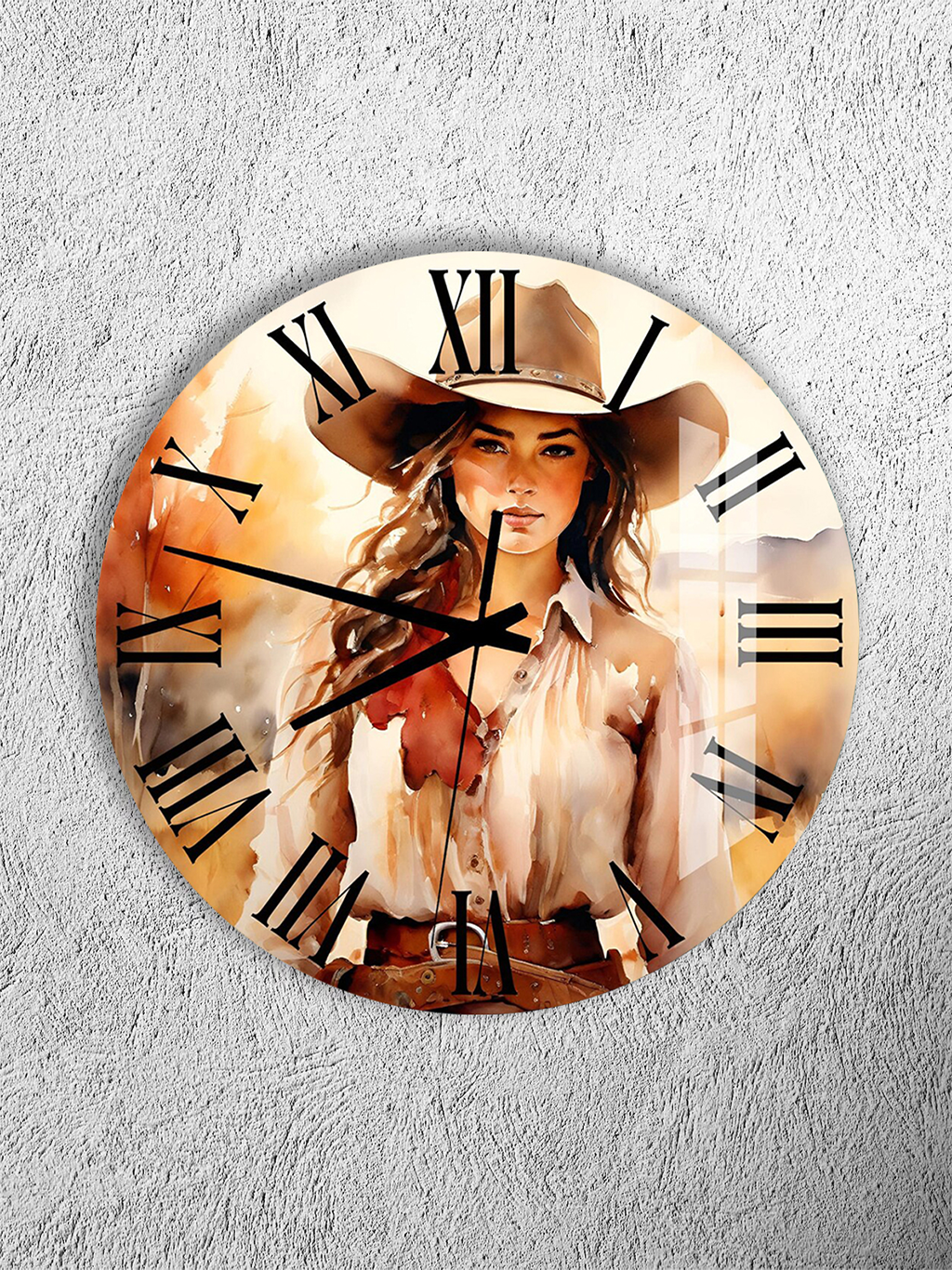 KIRILMAZ CAM DUVAR SAATİ, HEM TABLO HEM SAAT KOVBOY KADIN PORTRE SANATSAL TASARIM EV OFİS HEDİYESİ