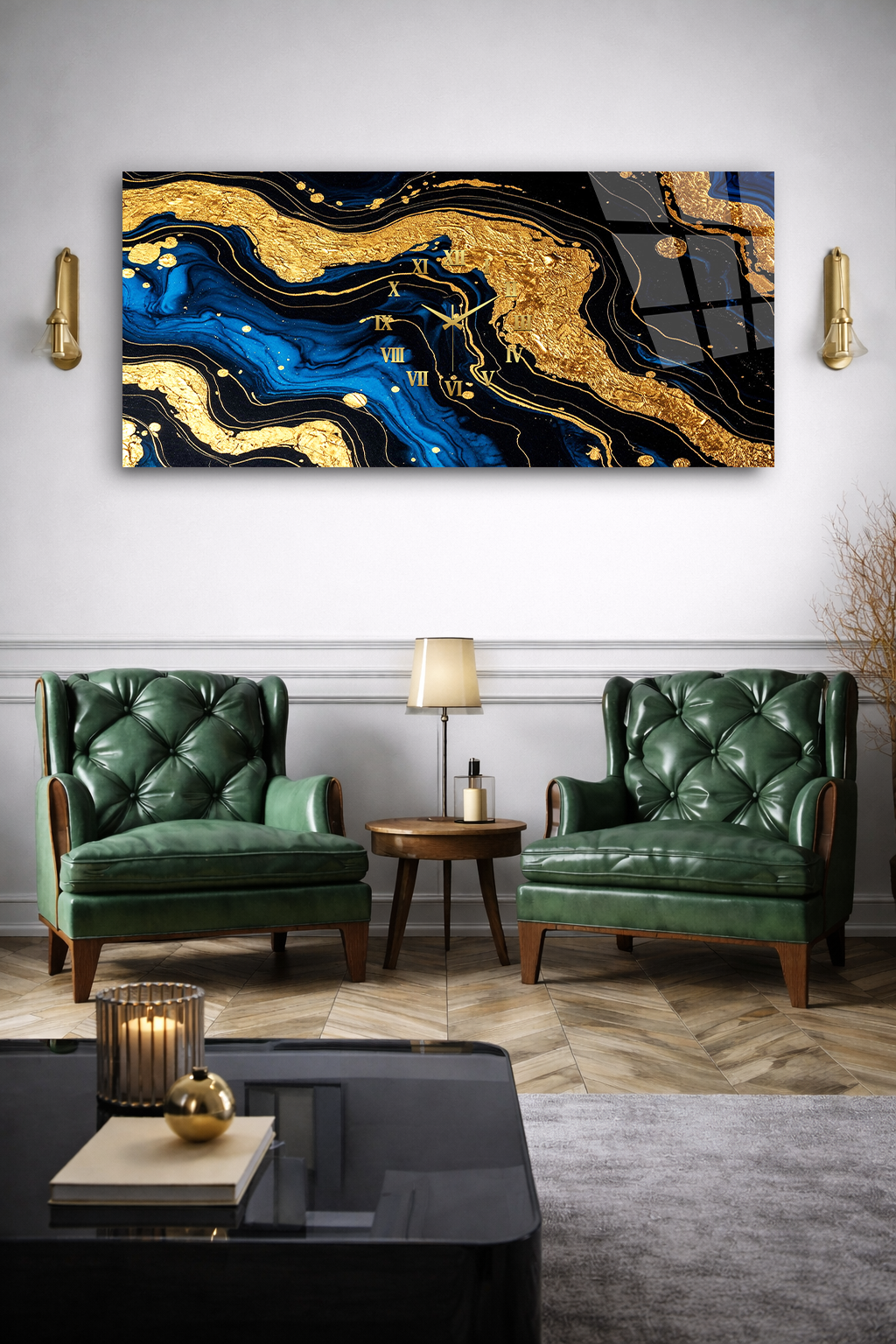 KIRILMAZ CAM DUVAR SAATİ , HEM TABLO HEM SAAT LACİVERT ALTIN MERMER LÜKS TASARIM EV OFİS HEDİYESİ