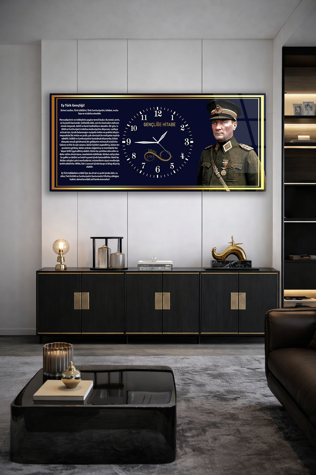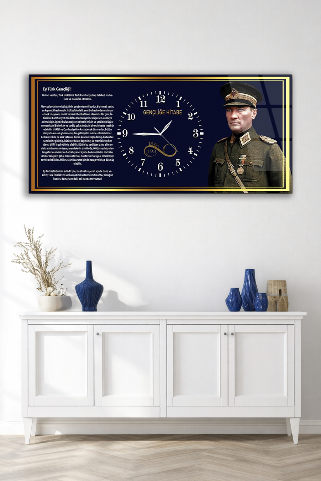 KIRILMAZ CAM DUVAR SAATİ , HEM TABLO HEM SAAT LACİVERT ATATÜRK GENÇLİĞE HİTABE EV OFİS HEDİYESİ
