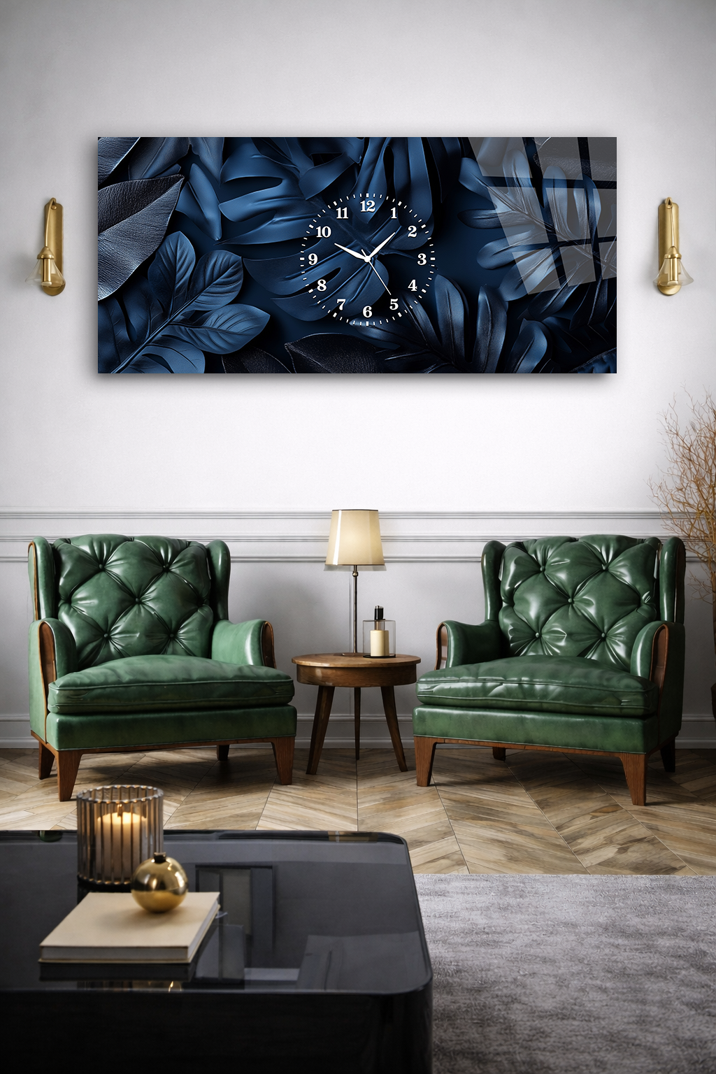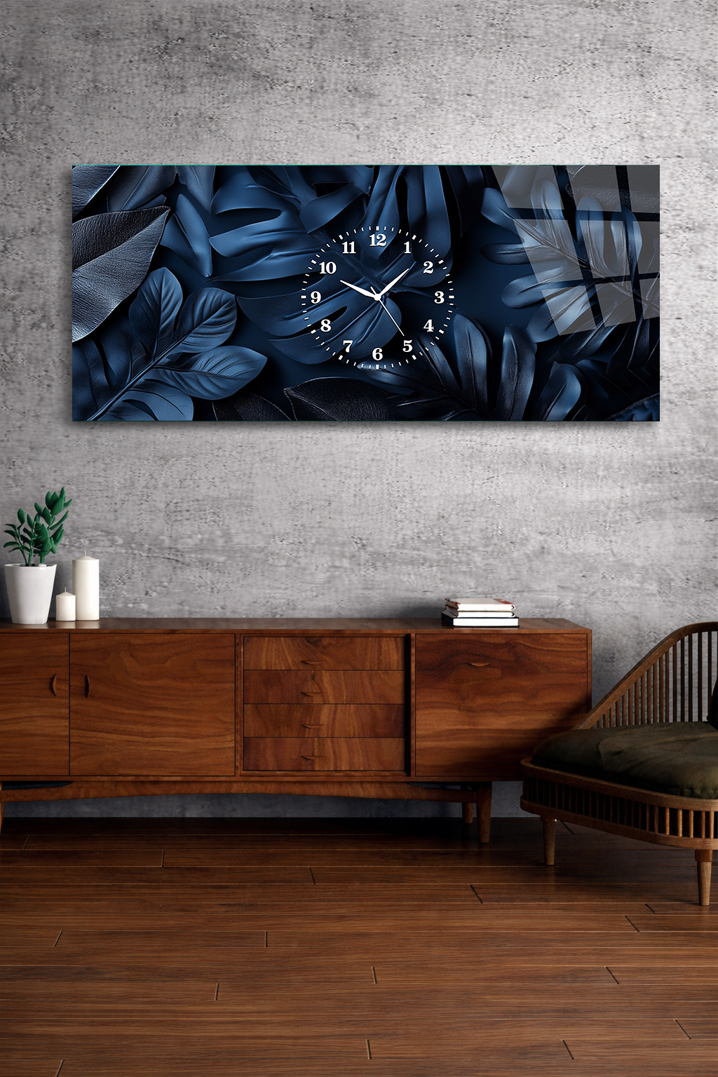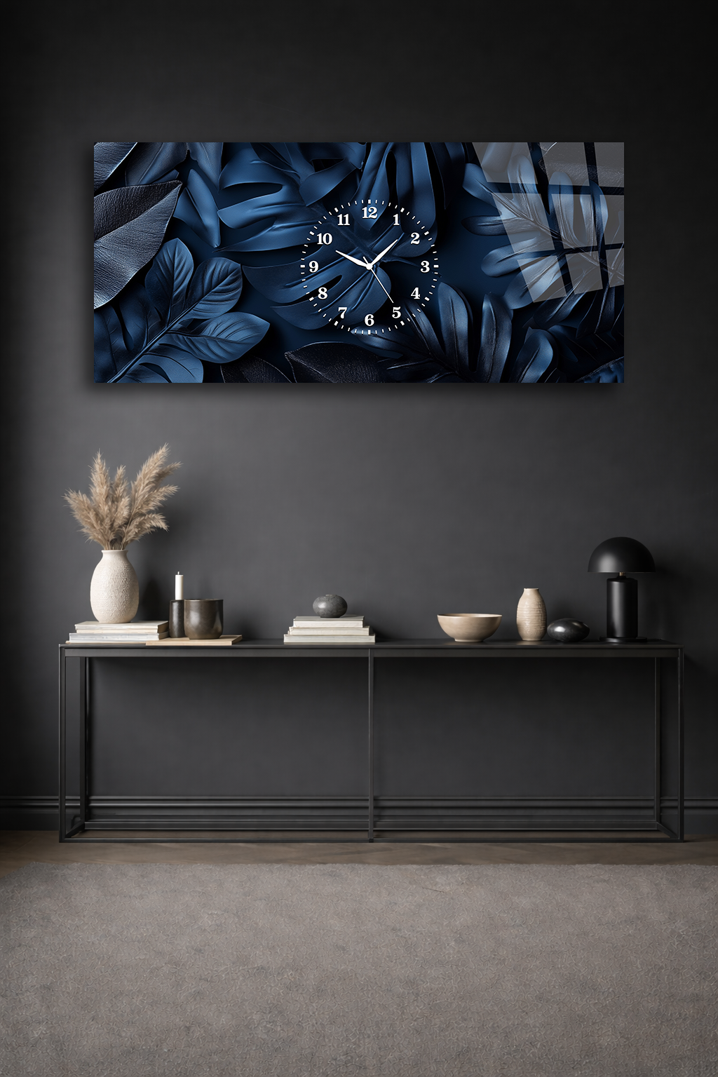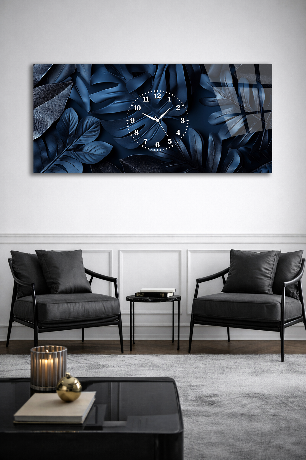 KIRILMAZ CAM DUVAR SAATİ , HEM TABLO HEM SAAT LACİVERT YAPRAK DESEN EV OFİS HEDİYESİ