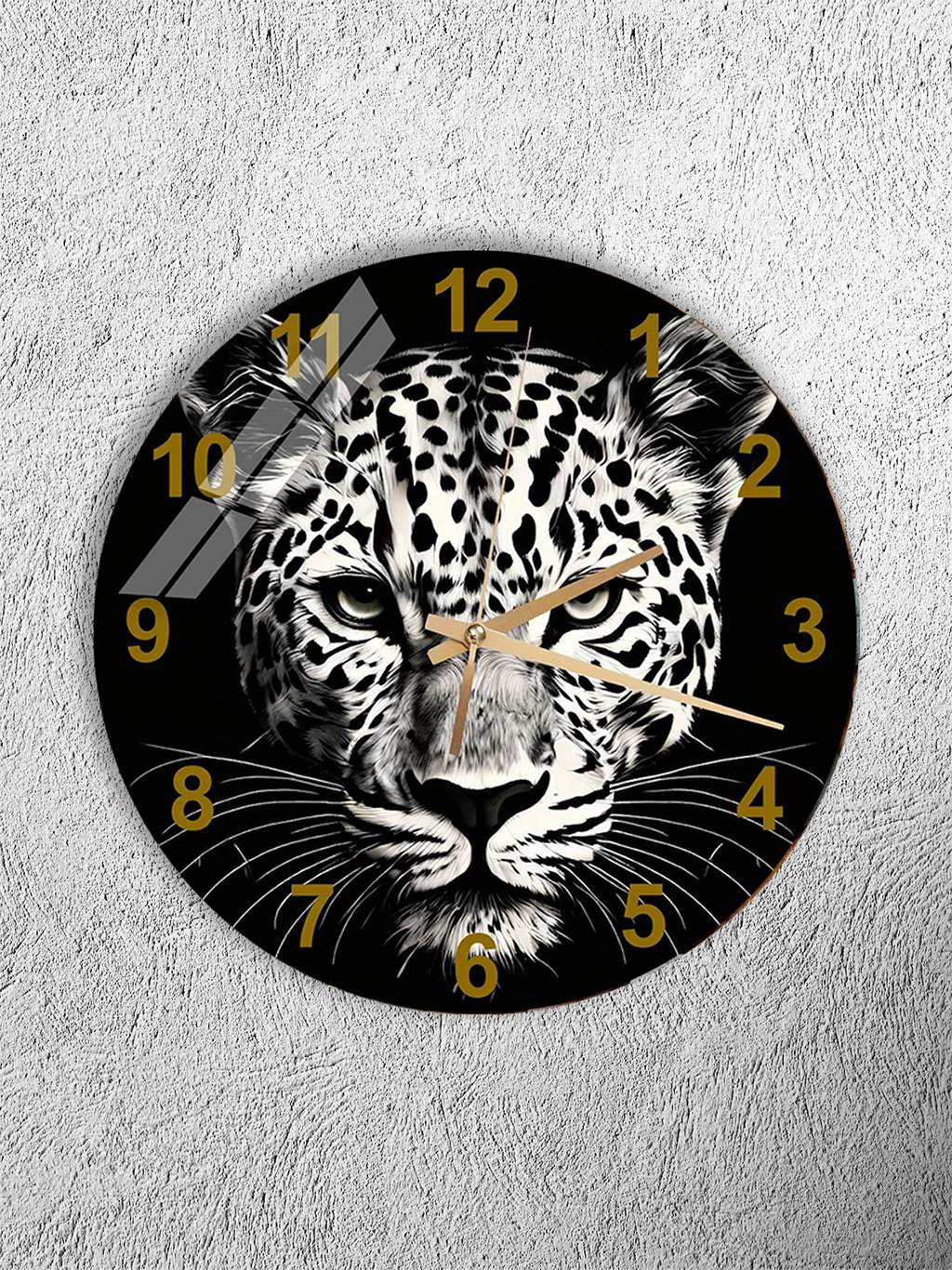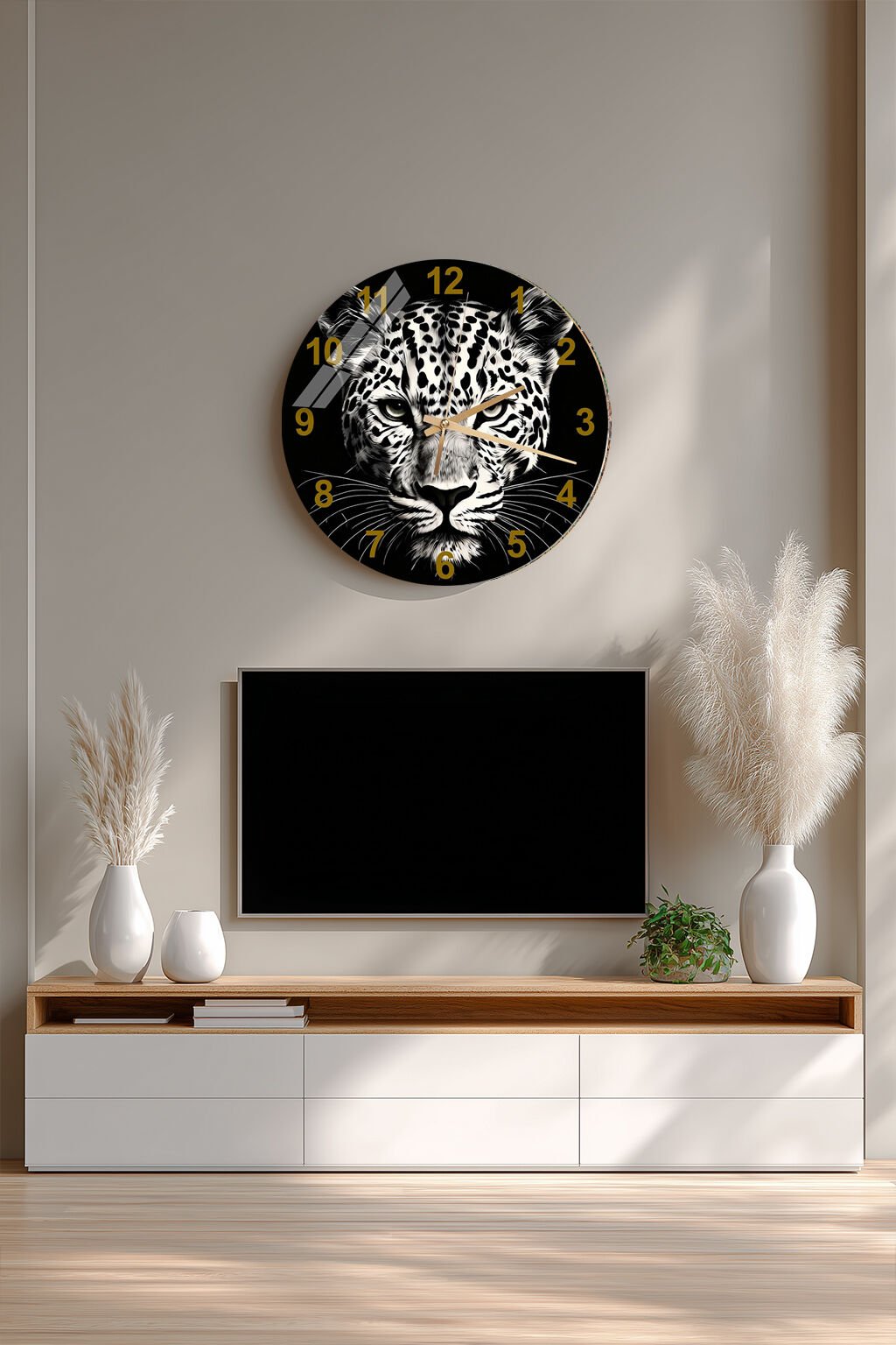 KIRILMAZ CAM DUVAR SAATİ, HEM TABLO HEM SAAT LEOPAR VAHŞİ YAŞAM LÜKS TASARIM EV OFİS HEDİYESİ