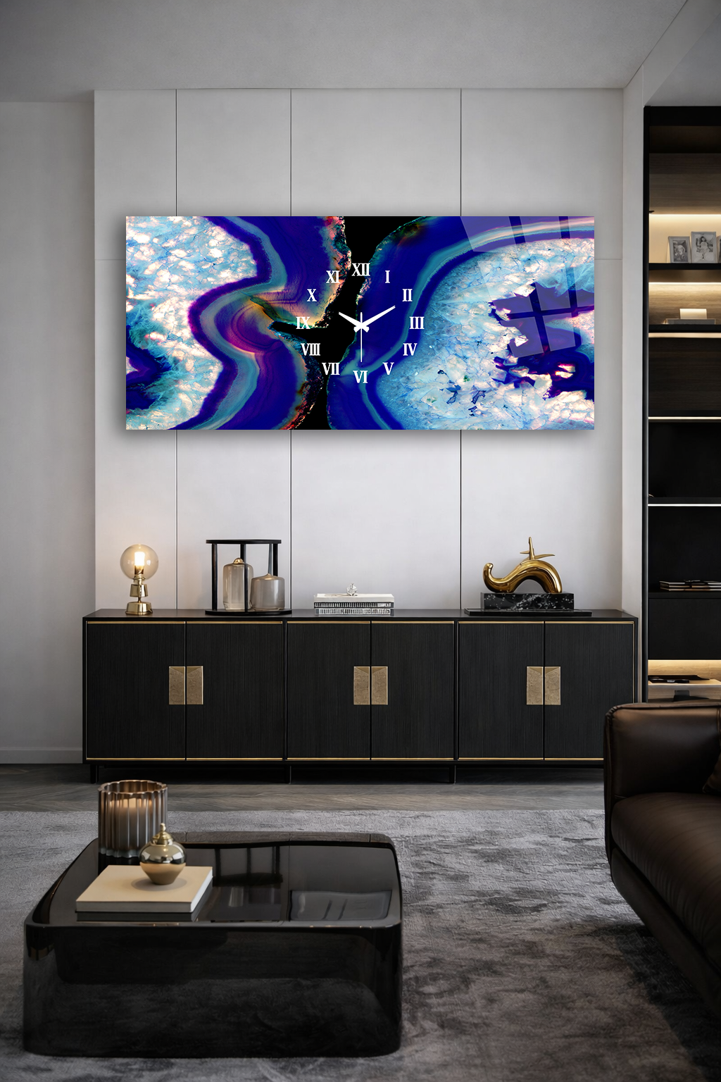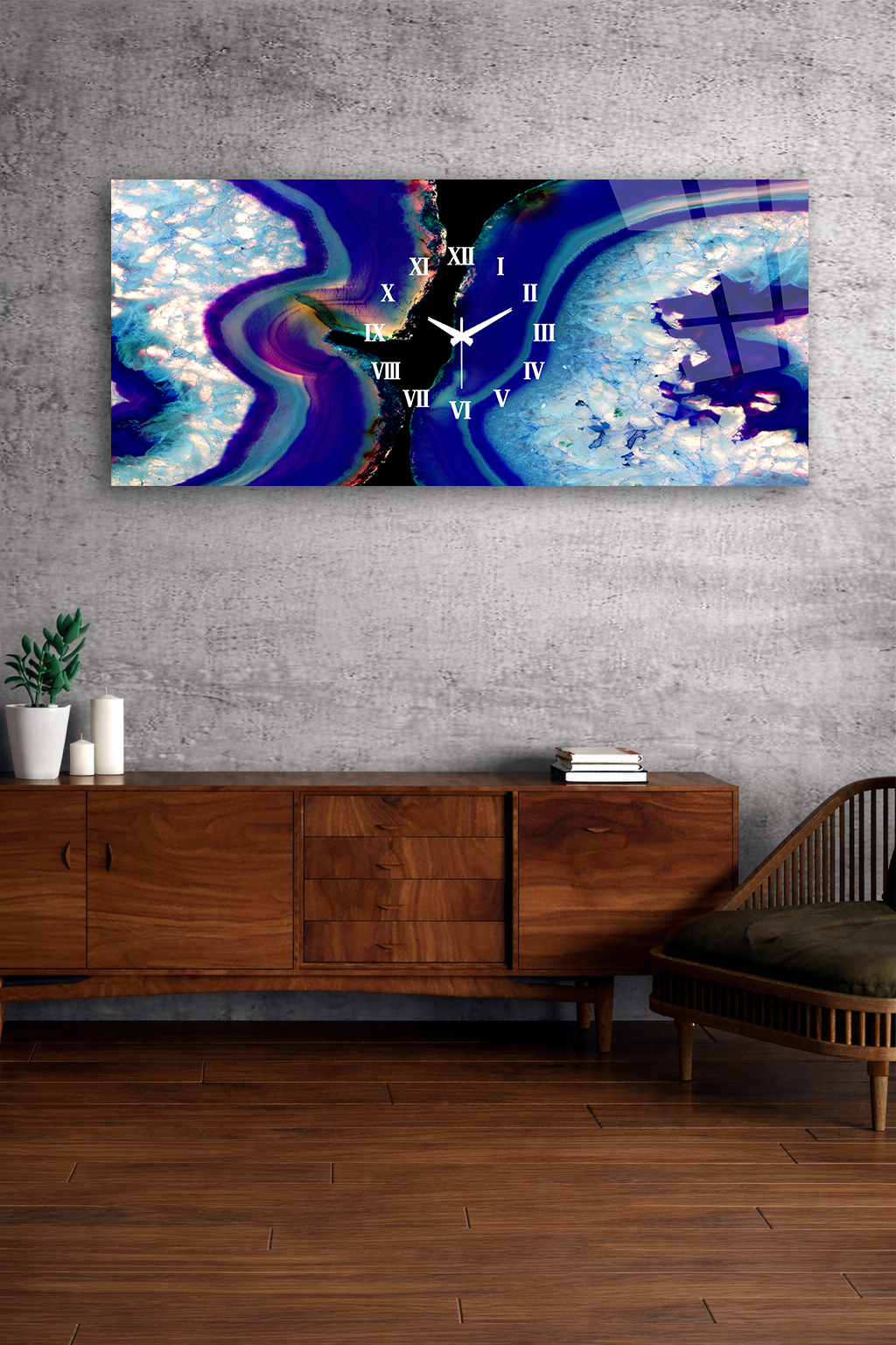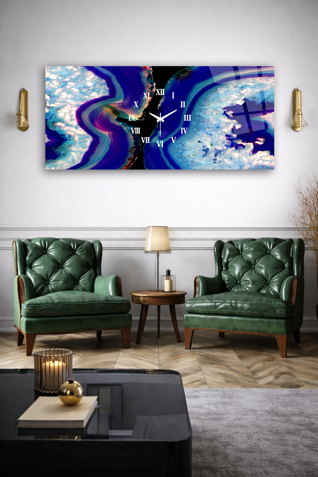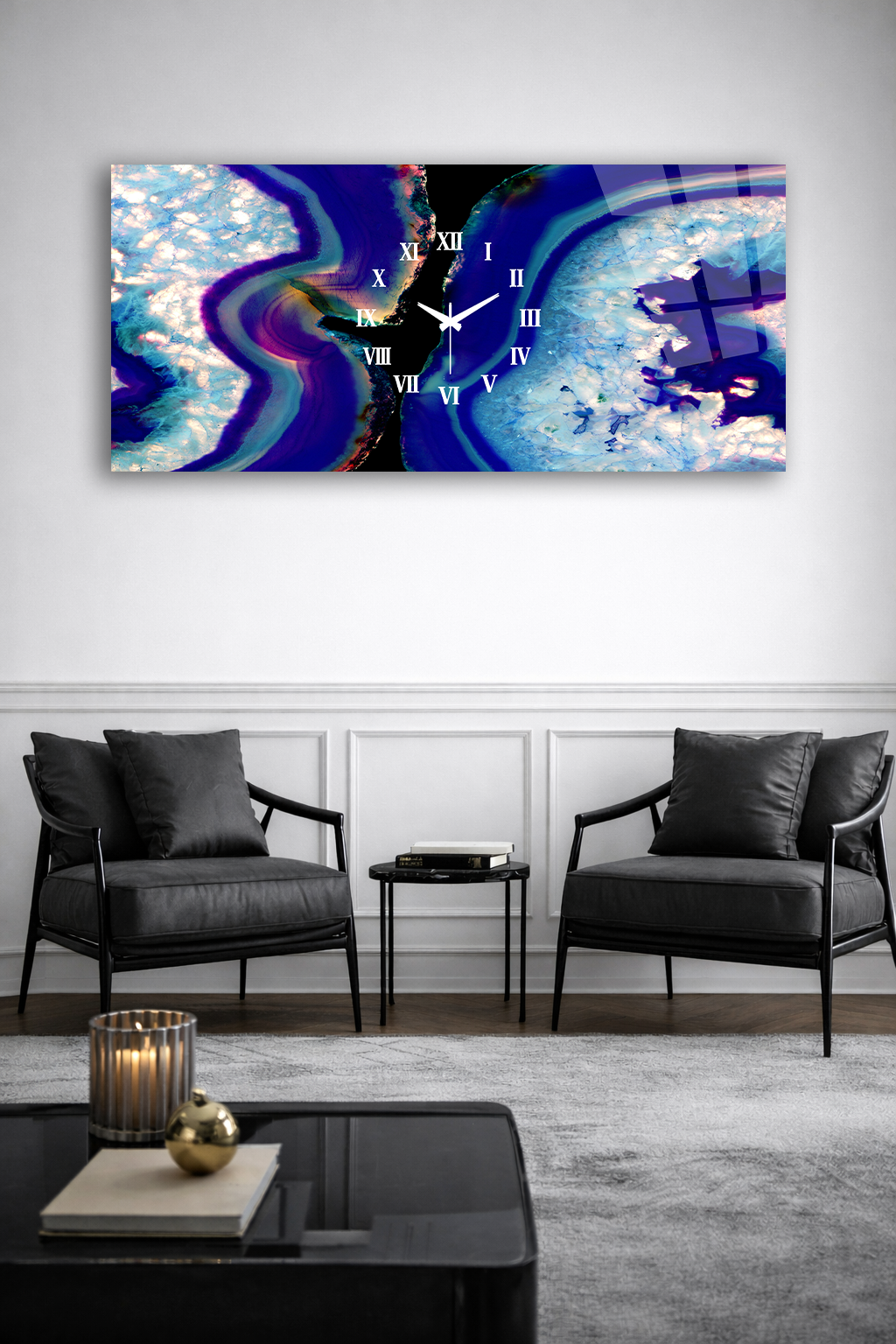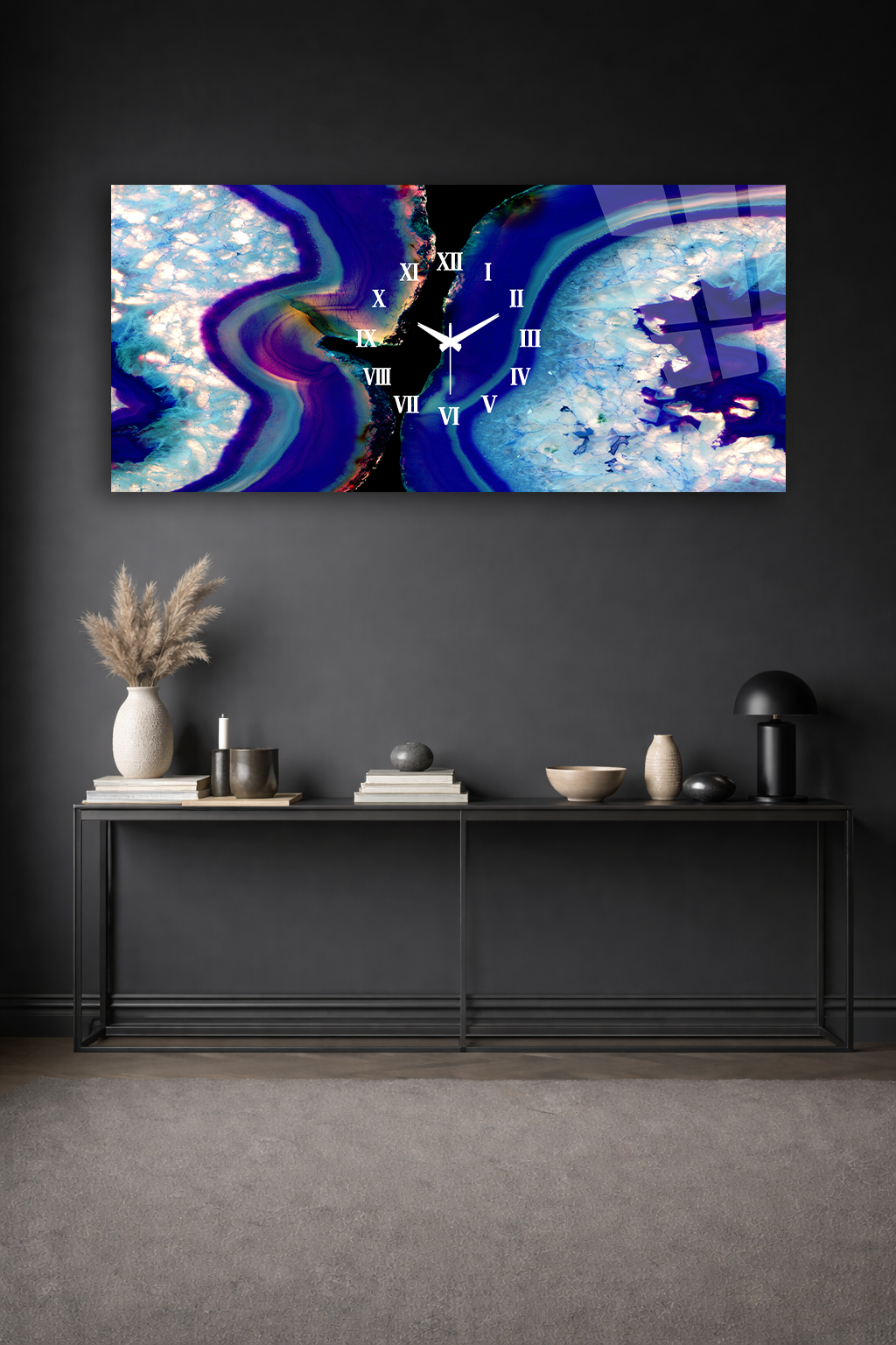 KIRILMAZ CAM DUVAR SAATİ , HEM TABLO HEM SAAT MAVİ AGAT DOĞAL TAŞ DESEN EV OFİS HEDİYESİ