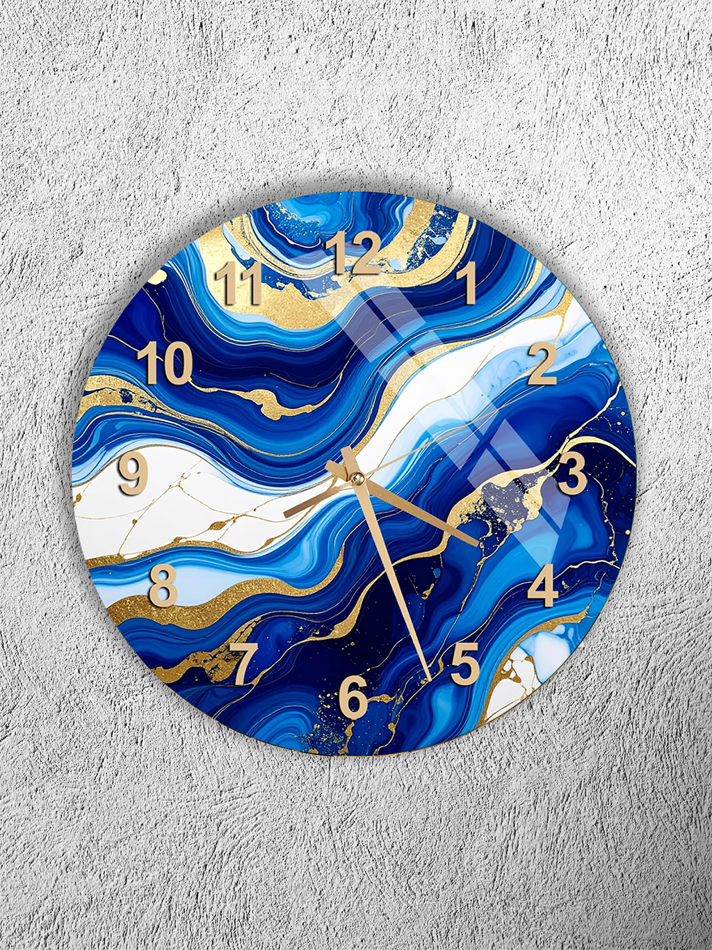 KIRILMAZ CAM DUVAR SAATİ, HEM TABLO HEM SAAT MAVİ ALTIN AKIŞ DESENLİ LÜKS EV OFİS HEDİYESİ