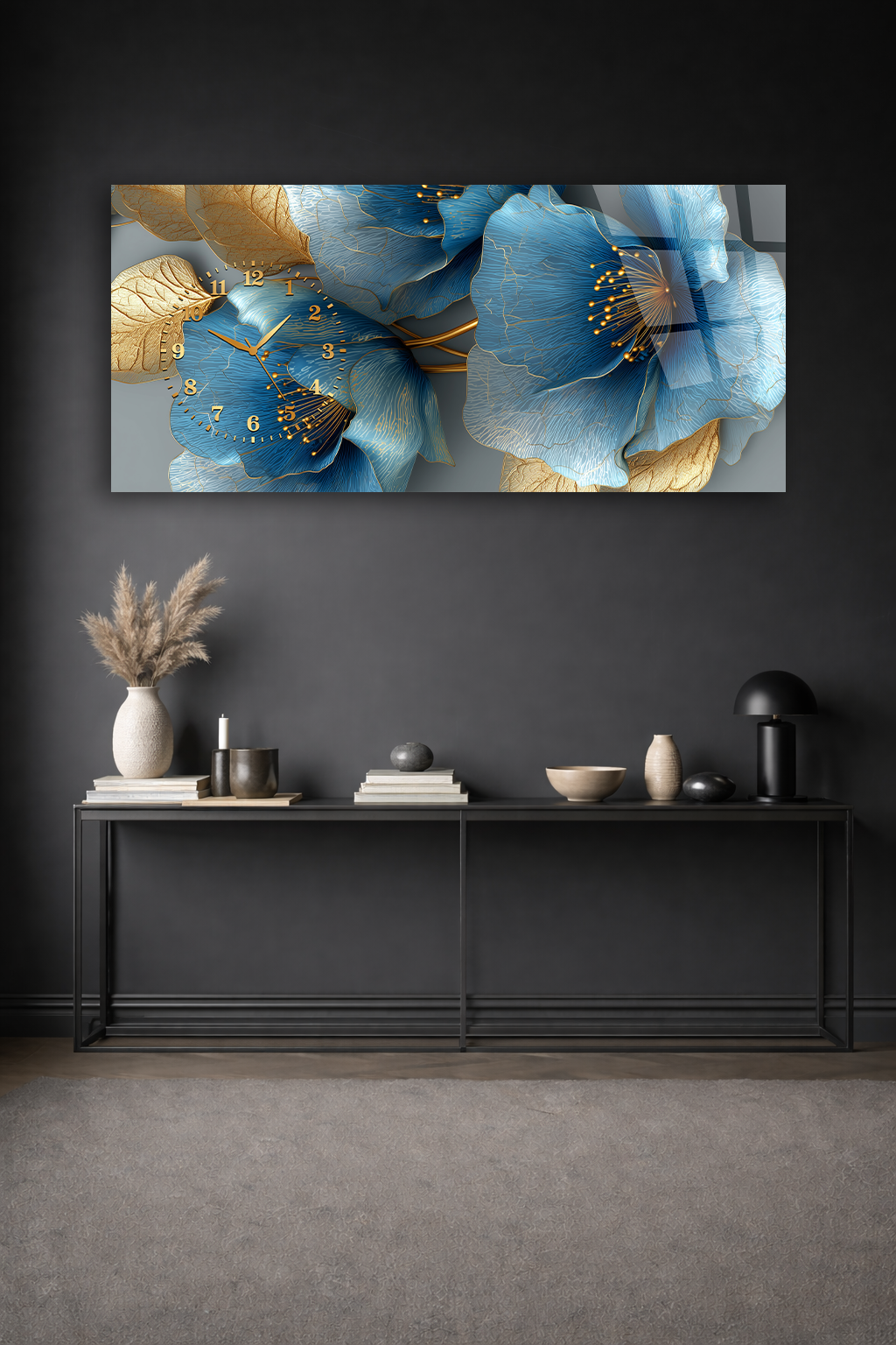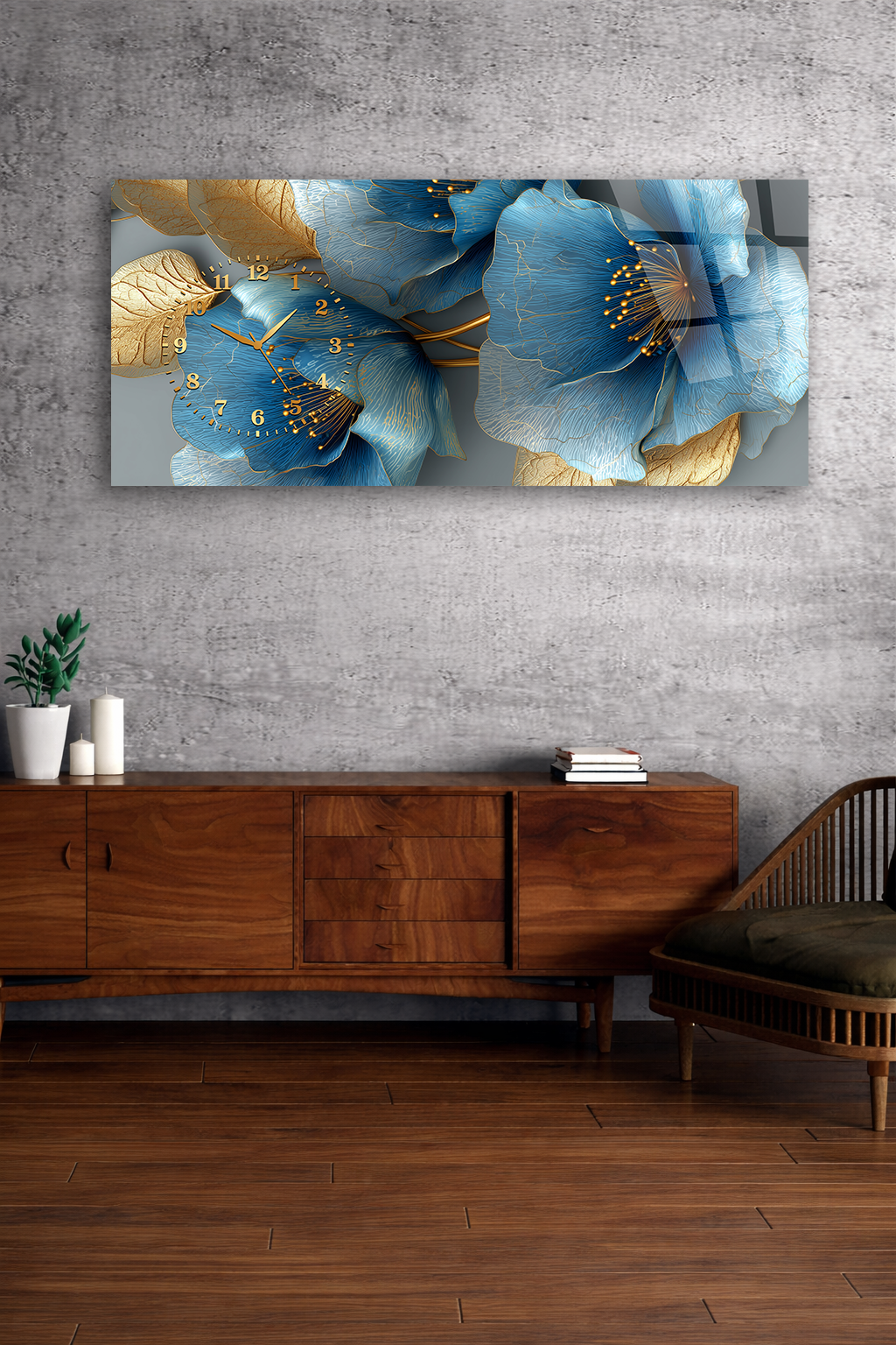KIRILMAZ CAM DUVAR SAATİ , HEM TABLO HEM SAAT MAVİ ALTIN ÇİÇEKLİ SANATSAL TASARIM EV OFİS HEDİYESİ