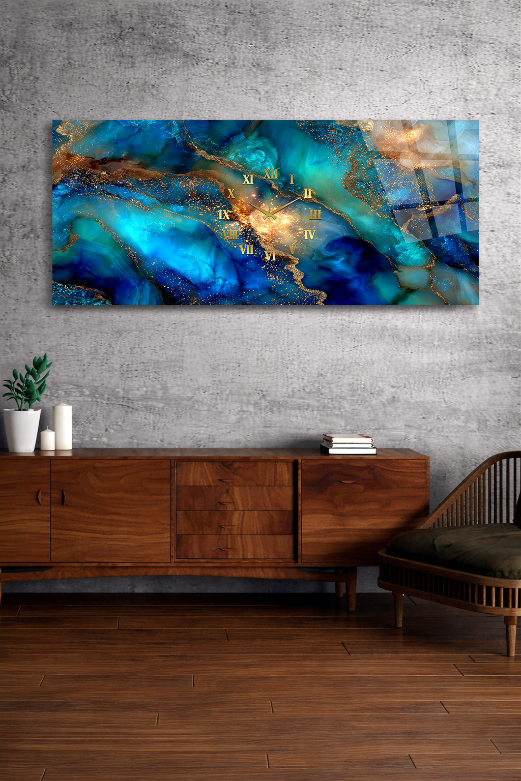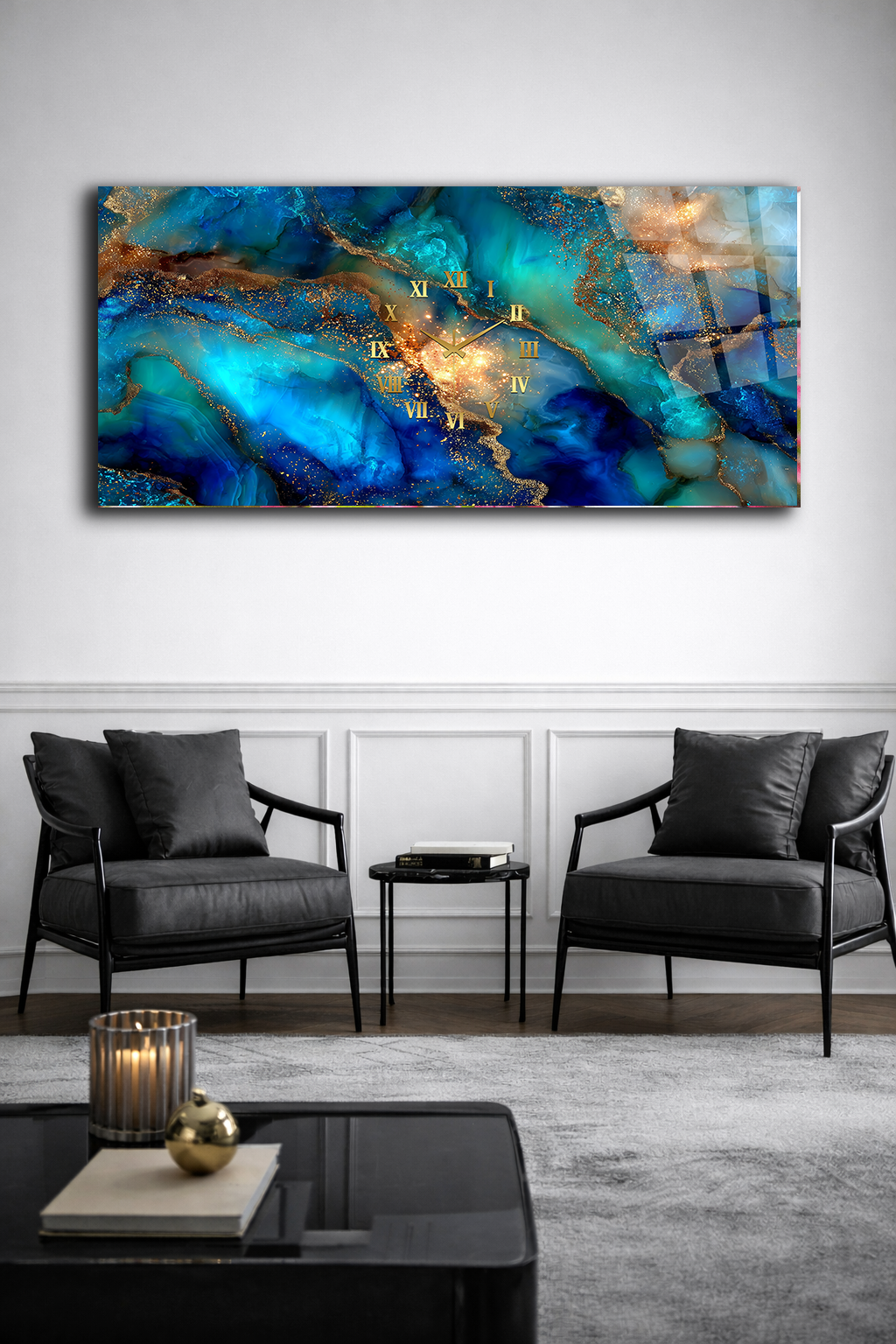 KIRILMAZ CAM DUVAR SAATİ , HEM TABLO HEM SAAT MAVİ ALTIN SOYUT MERMER TASARIM EV OFİS HEDİYESİ