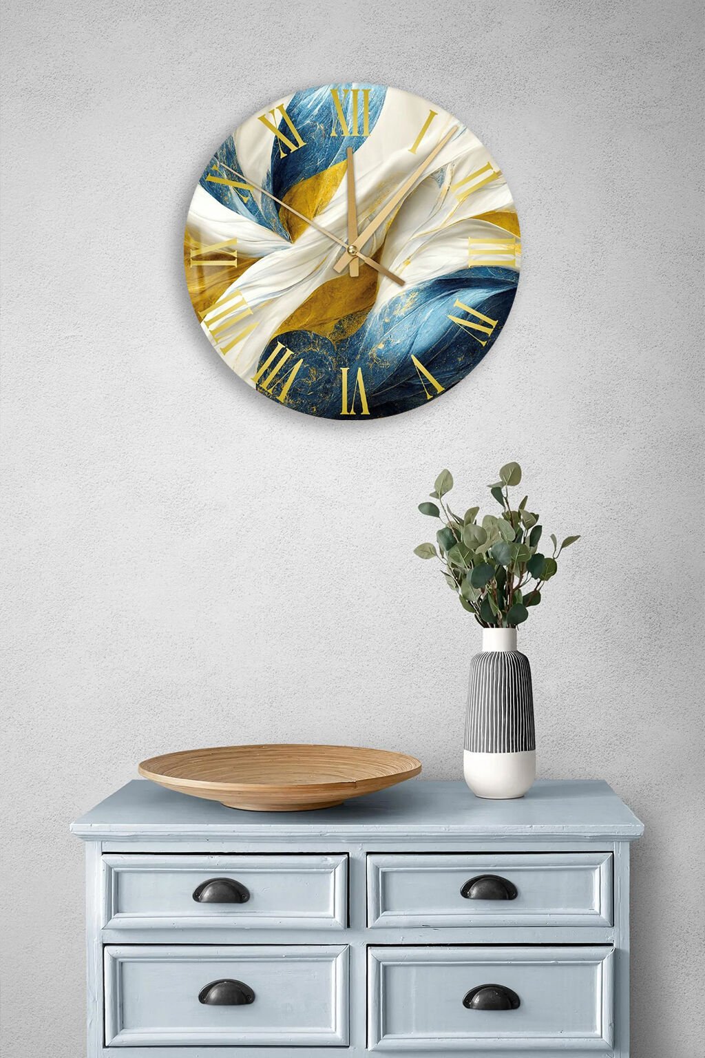 KIRILMAZ CAM DUVAR SAATİ, HEM TABLO HEM SAAT MAVİ BEYAZ ALTIN SOYUT SANAT LÜKS TASARIM EV OFİS HEDİYESİ