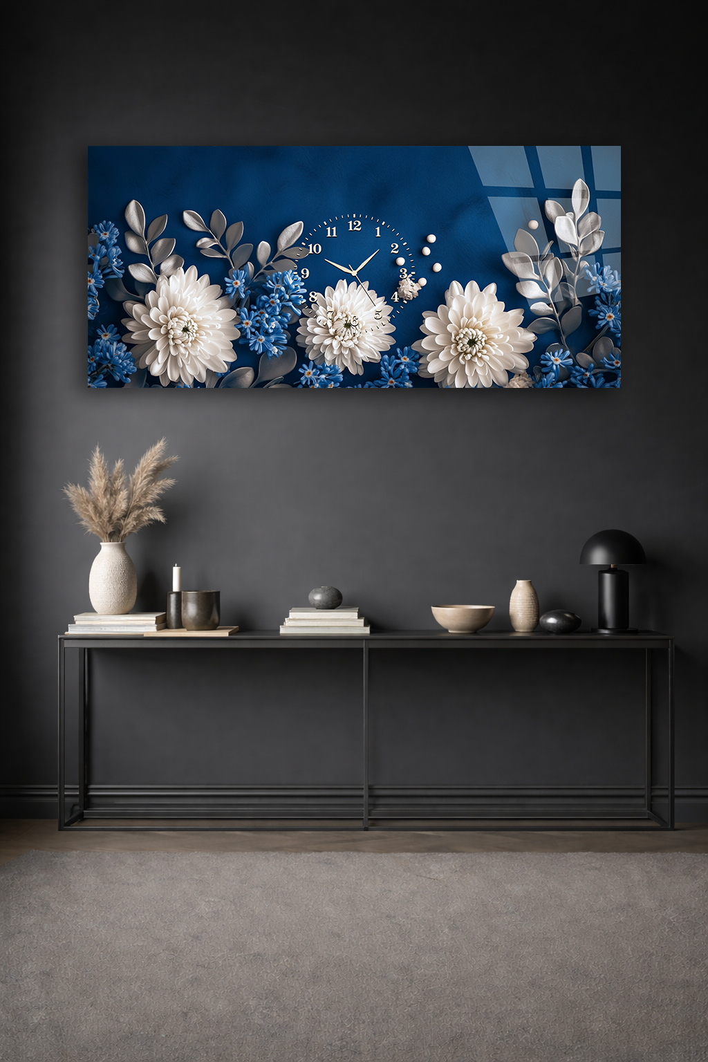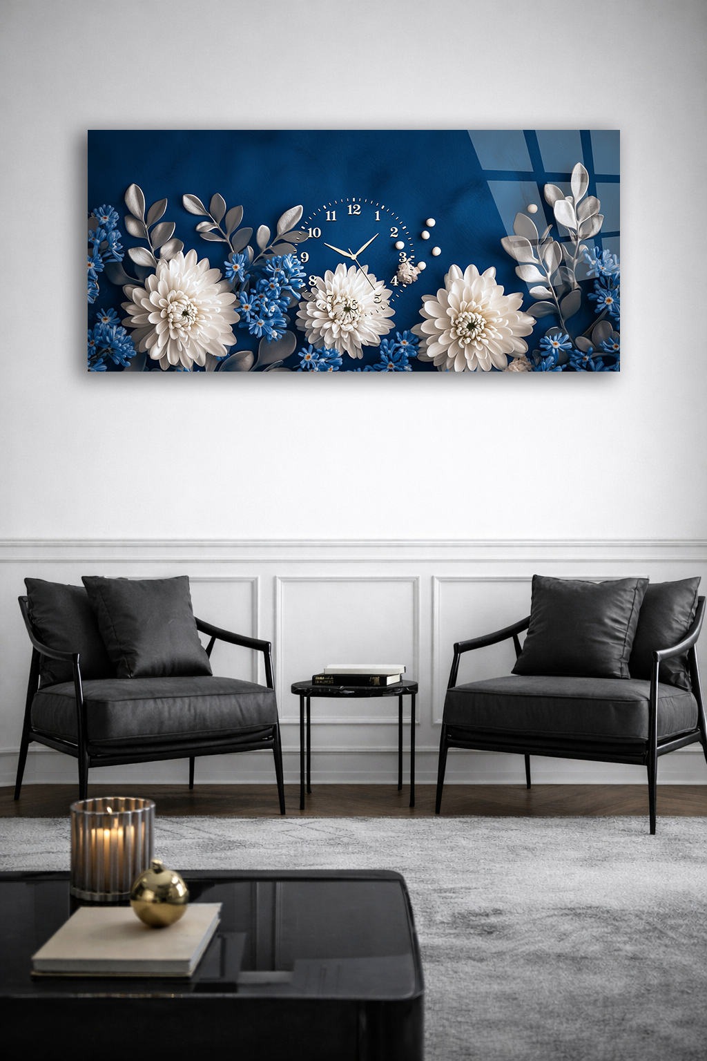 KIRILMAZ CAM DUVAR SAATİ , HEM TABLO HEM SAAT MAVİ BEYAZ ÇİÇEK DESENLİ EV OFİS HEDİYESİ