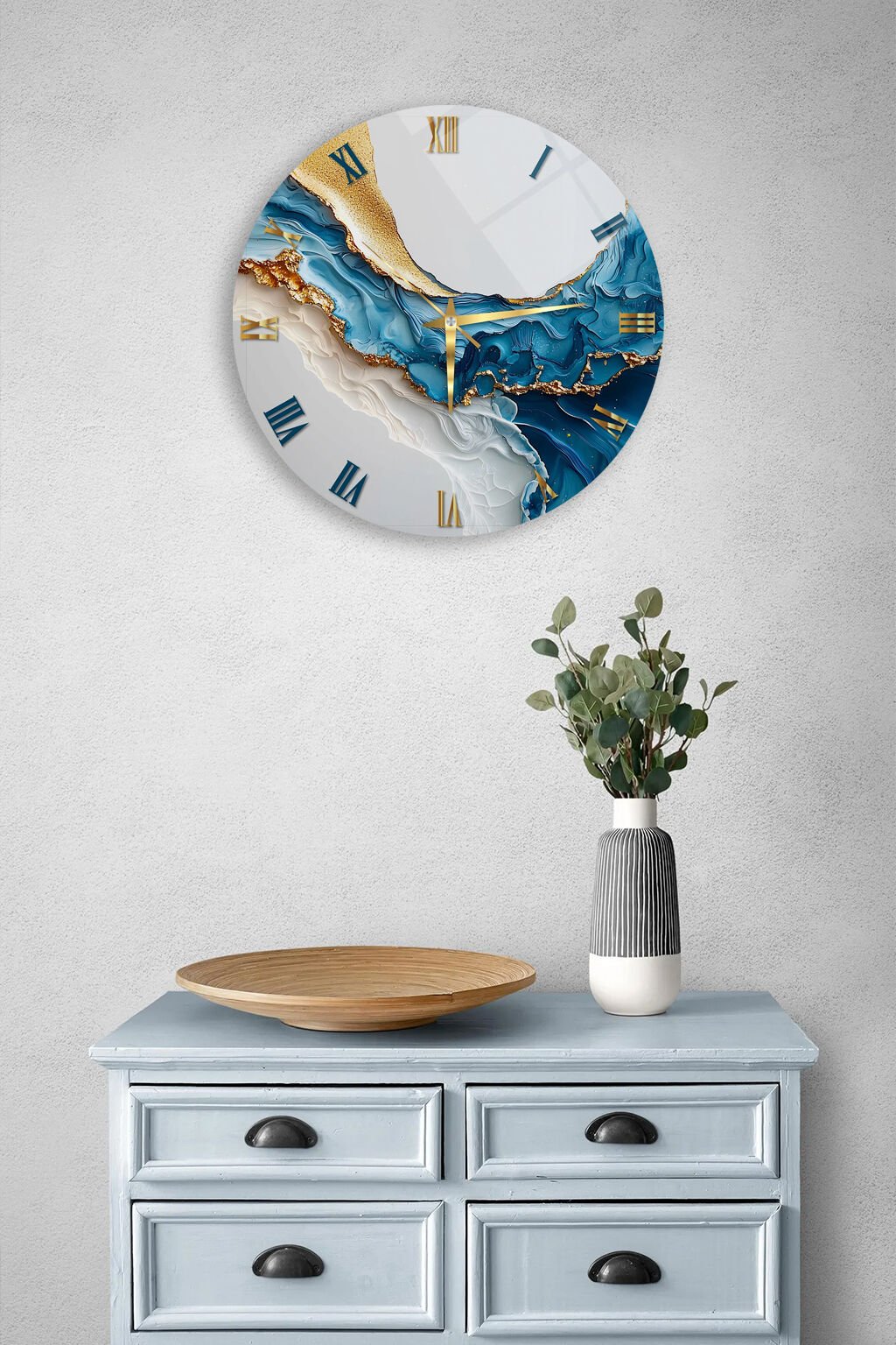 KIRILMAZ CAM DUVAR SAATİ, HEM TABLO HEM SAAT MAVİ BEYAZ MERMER EFEKTLİ LÜKS TASARIM EV OFİS HEDİYESİ