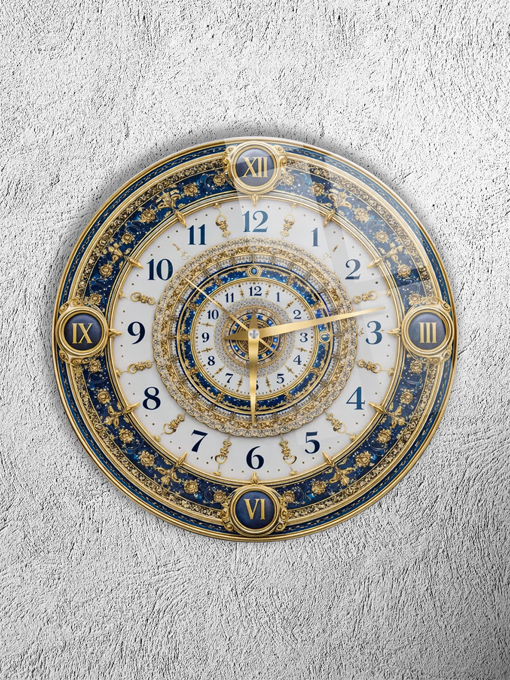 KIRILMAZ CAM DUVAR SAATİ, HEM TABLO HEM SAAT MAVİ GOLD KLASİK OSMANLI DESENLİ LÜKS TASARIM EV OFİS HEDİYESİ